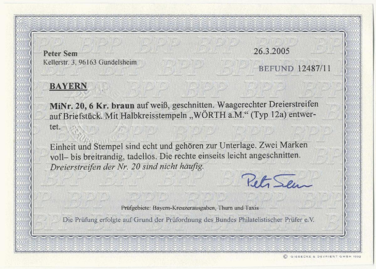 | Zusatzinformationen und Suchstichworte: | Deider 2. Online-Auktion 10. September 2022 Los 2041 Altdeutschland Bayern 6 Kr. braun im waager. Pracht-Dreierstreifen (rechte Marke leicht angeschn.) auf dekorativem Briefstück mit HK "WÖRTH a.M.", Fotobefund Sem BPP. Ausruf 300,00 EUR |