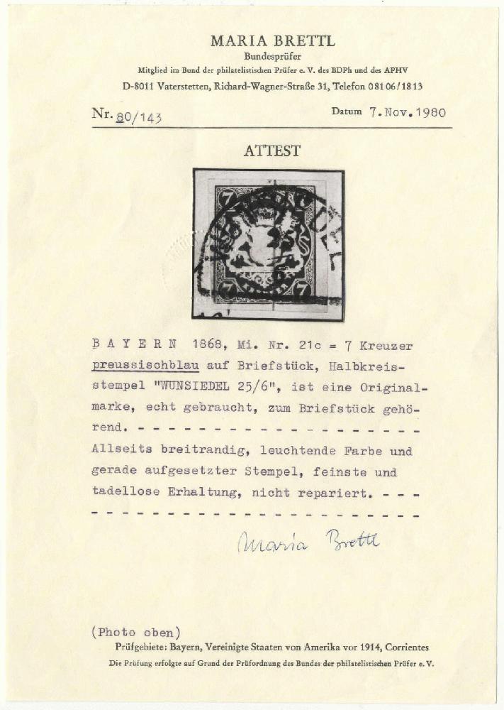 | Zusatzinformationen und Suchstichworte: | Deider 2. Online-Auktion 10. September 2022 Los 2044 Altdeutschland Bayern 7 Kr. preussischblau, Luxusstück in besonders tiefer und leuchtender Farbe auf dekorativem Briefstück mit vollem HK "WUNSIEDEL", Fotoattest Brettl BPP. Ausruf 500,00 EUR |