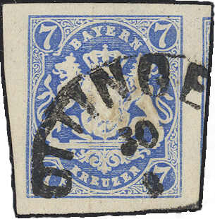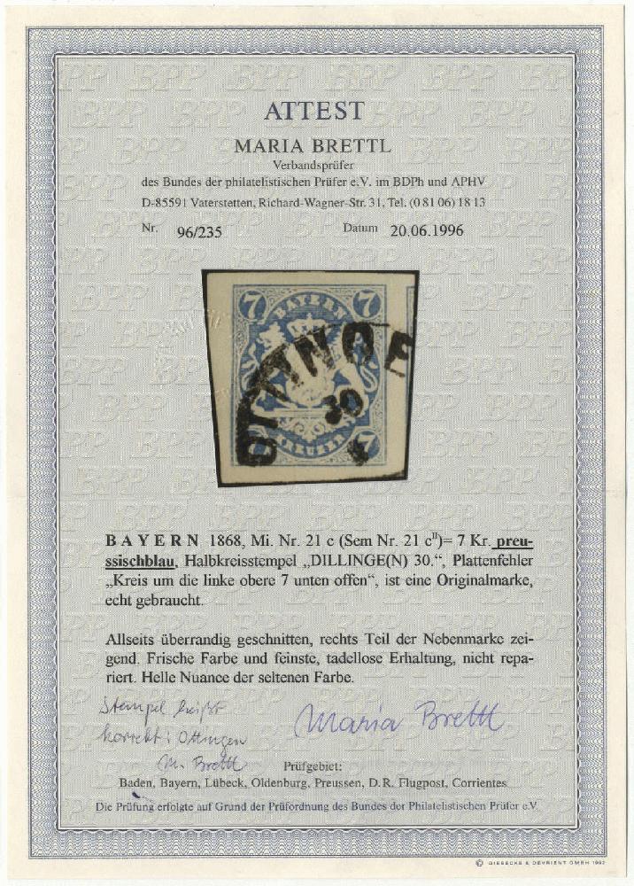 | Zusatzinformationen und Suchstichworte: | Deider 2. Online-Auktion 10. September 2022 Los 2045 Altdeutschland Bayern 7 Kr. preussischblau, Luxusstück mit Plattenfehler (Sem 21c II), in der seltenen hellen Nuance mit Halbkreisstempel "OTTINGEN", Fotoattest Brettl BPP. Ausruf 350,00 EUR |