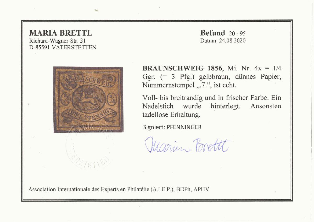 | Zusatzinformationen und Suchstichworte: | Deider 2. Online-Auktion 10. September 2022 Los 3003 Altdeutschland Braunschweig 1/4 Ggr. (= 3 Pfg.) gelbbraun, dünnes Papier, Prachtstück (Nadelstich hinterlegt) mit Nummernstempel "7", Fotobefund Brettl, Mi. 500.-- Zuschlag 48,00 EUR |
