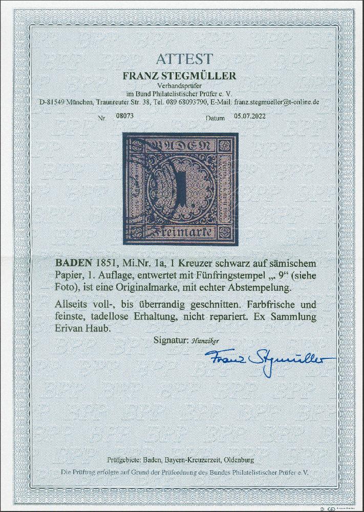 | Zusatzinformationen und Suchstichworte: | 379. Auktion Heinrich Köhler 19. - 24. September 2022 Los 1 1 Kreuzer schwarz auf sämisch, voll- bis überrandig, links mit Teil der Nachbarmarke, farbfrisch, sauber gestempelt, tadellos, signiert Hunziker und Fotoattest Stegmüller BPP (2022) Ausruf 200,00 EUR Zuschlag 320,00 EUR (aus der Sammlung Erivan Haub) |