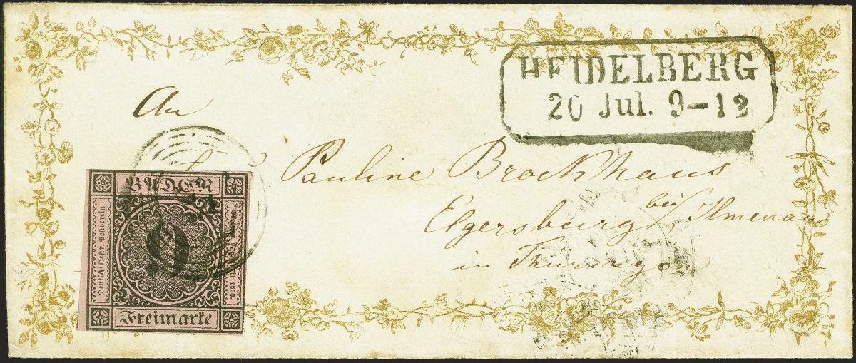 | Zusatzinformationen und Suchstichworte: | 379. Auktion Heinrich Köhler 19. - 24. September 2022 Los 7 1851, 9 Kreuzer schwarz auf lilarosa, zweiseitig leicht berührt, sonst voll- bis breitrandig, mit sauber aufgesetzter Nummer "57" und sauber nebengesetztem Rahmenstempel "HEIDELBERG 20 Jul." (1855) auf kleinem, mit goldfarbenen Blumenranken bedrucktem Zierkuvert nach Elgersburg bei Ilmenau mit Durchgangs- und Ankunftsstempel. Ein ebenso schöner wie seltener Brief in tadelloser Erhaltung. Fotoattest Stegmüller BPP (2022) (Mi.-Nr. 4b) Ausruf 1.000,00 EUR Zuschlag 3.400,00 EUR (aus der Sammlung Erivan Haub) |