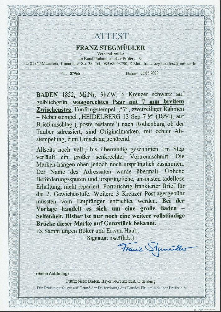 | Zusatzinformationen und Suchstichworte: | 379. Auktion Heinrich Köhler 19. - 24. September 2022 Los 10 1851/52, 6 Kreuzer auf gelblichgrün im waagerechten Zwischenstegpaar mit 7 mm breitem Steg, farbfrisch und voll- bis meist breitrandig, oben mit Teilen der Nachbarmarken, mit leicht aufgesetzter Nr. "57" auf Briefkuvert der zweiten Gewichtsstufe mit nebengesetztem Aufgabestempel "HEIDELBERG 13 Sep." (1854) nach Rothenburg ob der Tauber. Im Zwischensteg verläuft ein langer Vortrennschnitt, das Paar hängt aber oben noch ursprünglich zusammen; der Name des Adressaten wurde übermalt und das Kuvert zeigt übliche leichte Beförderungspuren, sonst einwandfreie Erhaltung. Eine der großen Seltenheit der Baden-Philatelie. Es sind nur fünf badische 'Brücken' auf Ganzstück registriert, darunter der legendäre 'König Carol-Brief'. Signiert Friedl mit Attest (1951), Fotoattest Stegmüller BPP (2022) Ausruf 20.000,00 EUR Zuschlag 20.000,00 EUR (aus der Sammlung Erivan Haub) |