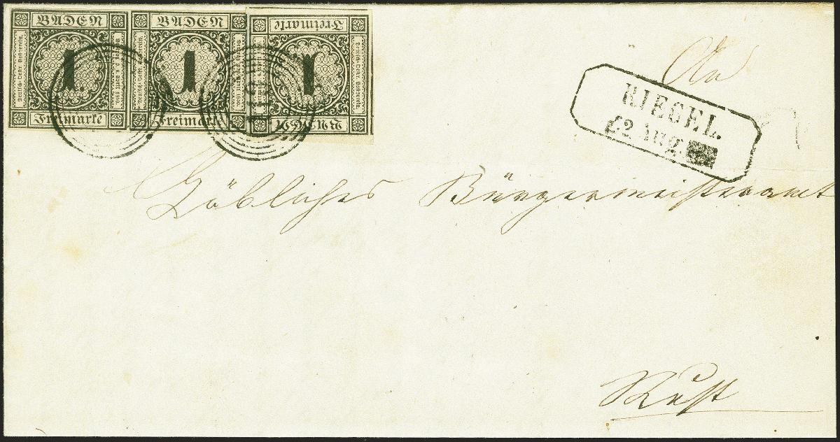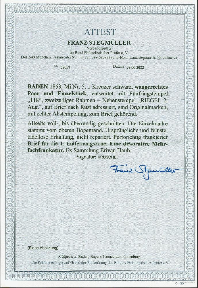 | Zusatzinformationen und Suchstichworte: | 379. Auktion Heinrich Köhler 19. - 24. September 2022 Los 11 1 Kreuzer schwarz, waagerechtes Paar und Einzelwert, alle voll-bis überrandig, die Einzelmarke vom oberen Bogenrand stammend, mit Nr. "118" und nebengesetztem Rahmenstempel "RIEGEL 2 Aug." (1859) auf Faltbrief nach Rust. Schöne und einwandfreier Erhaltung. Fotoattest Stegmüller BPP Ausruf 100,00 EUR Zuschlag 520,00 EUR (aus der Sammlung Erivan Haub) |