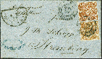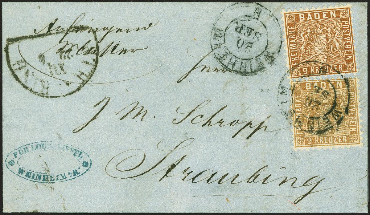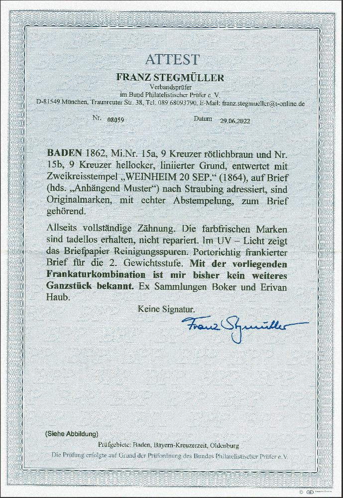 | Zusatzinformationen und Suchstichworte: | 379. Auktion Heinrich Köhler 19. - 24. September 2022 Los 16 1862, 9 Kreuzer rötlichbraun und 9 Kreuzer hellocker, mit sauber auf- und nebengesetztem Doppelkreisstempel "WEINHEIM 20 SEP."(1864) auf Faltbrief der 2. Gewichtsstufe mit Vermerk "Anhängend Muster" nach Straubing mit vorderseitigem Ankunftsstempel. Die Frankatur frisch und tadellos, die Hülle unauffällige kleine Reinigungsspuren. Eine ganz außergewöhnliche Frankaturkombination, die kein zweites mal registriert ist. Fotoattest Stegmüller BPP (2022) Ausruf 1.000,00 EUR Zuschlag 3.200,00 EUR (aus der Sammlung Erivan Haub) |