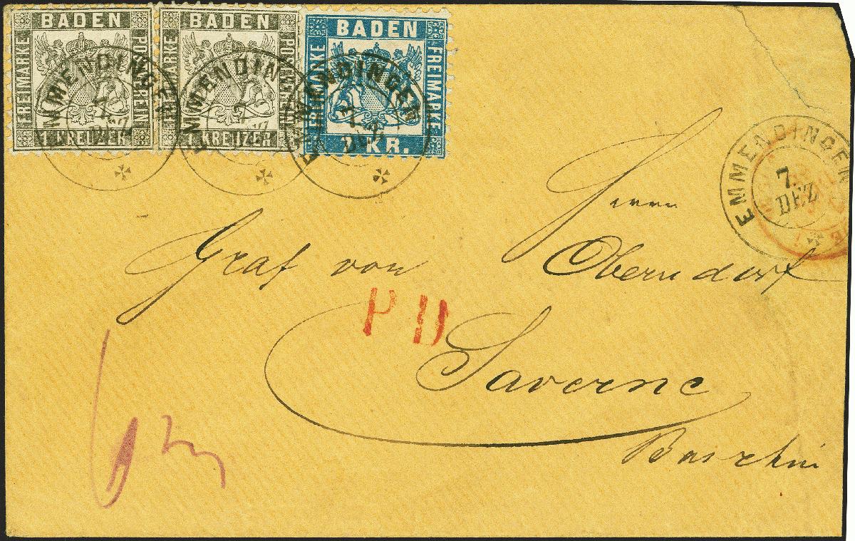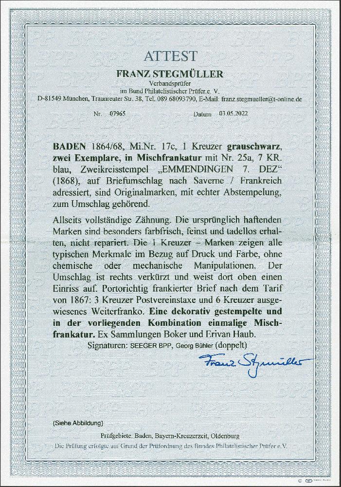 | Zusatzinformationen und Suchstichworte: | 379. Auktion Heinrich Köhler 19. - 24. September 2022 Los 17 1862/66, 1 Kreuzer grauschwarz, zwei Einzelwerte in Mischfrankatur mit 1868, 7 Kreuzer blau, alle farbfrisch und einwandfrei gezähnt, mit jeweils sauber aufgesetztem Doppelkreisstempel "EMMENDINGEN 7. DEZ" (1868) auf Briefumschlag nach Saverne, Frankreich. Die Frankatur ist tadellos erhalten, der Umschlag rechts verkürzt mit senkrechten Bügen und Einriss oben. Eine attraktive und in dieser Kombination einmalige Mischfrankatur. Signiert Georg Bühler und Seeger BPP, Fotoattest Stegmüller BPP (2022) Ausruf 1.500,00 EUR Zuschlag 1.500,00 EUR (aus der Sammlung Erivan Haub) |