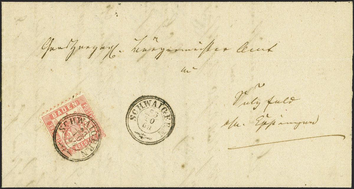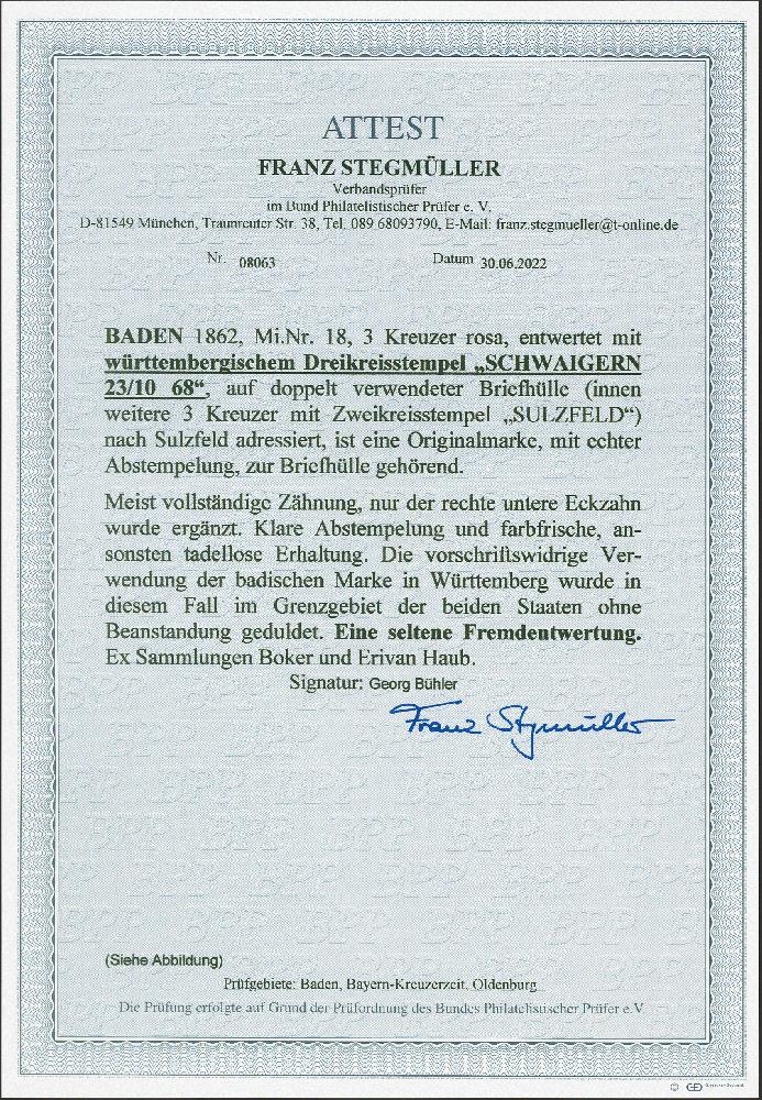 | Zusatzinformationen und Suchstichworte: | 379. Auktion Heinrich Köhler 19. - 24. September 2022 Los 19 1862/66, 3 Kreuzer rosa, farbfrisch und meist gut gezähnt, lediglich der rechte untere Eckzahn ergänzt, mit auf- und nebengesetztem württembergischen Doppelkreisstempel "SCHWAIGERN 23/10 68" auf doppelt verwendeter Briefhülle (innen mit weiterer 3 Kreuzer mit Doppelkreisstempel "SULZFELD" nach Schwaigern) nach Eppingen. Eine sehr seltene und unbeanstandet beförderte Fremdverwendung. Fotoattest Stegmüller BPP (2022) Ausruf 1.000,00 EUR Zuschlag 1.450,00 EUR (aus der Sammlung Erivan Haub) |