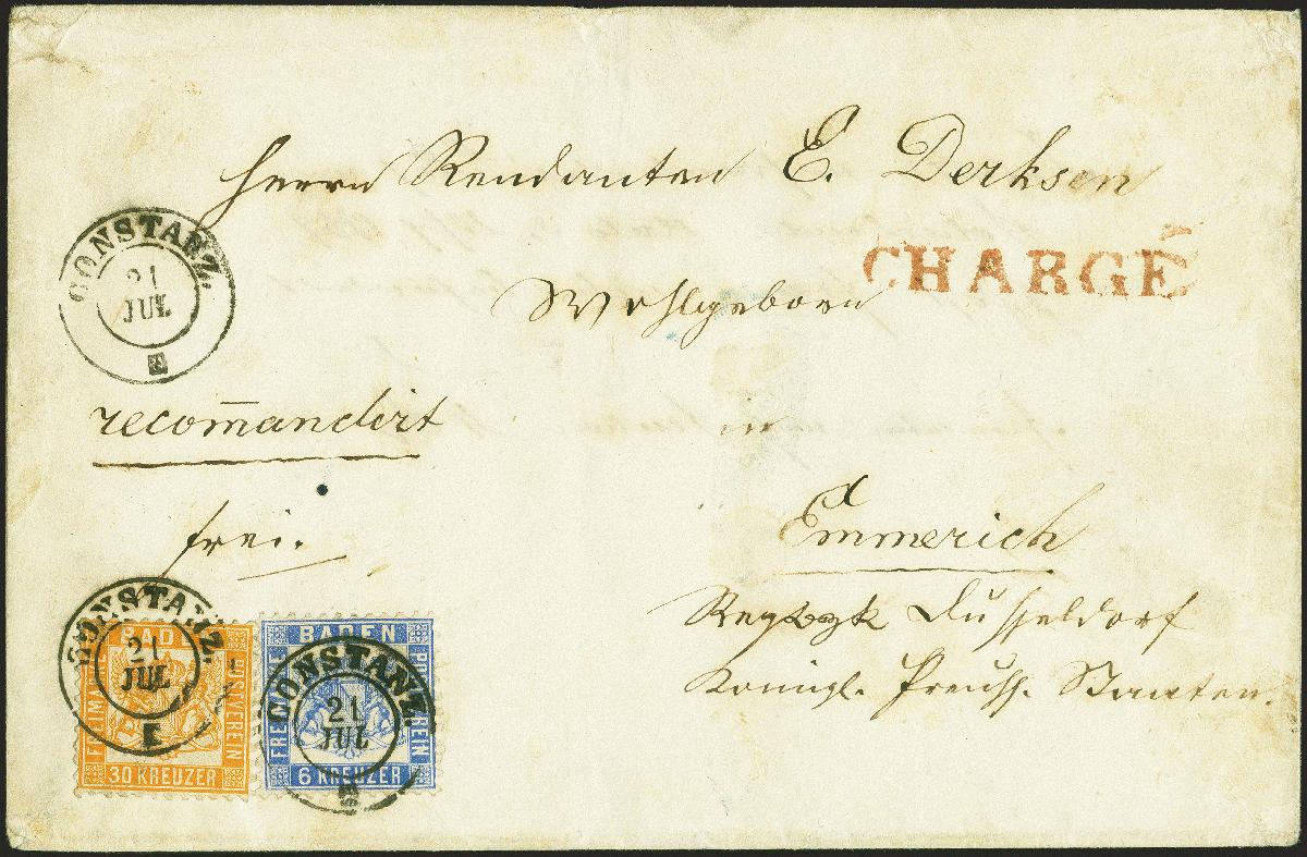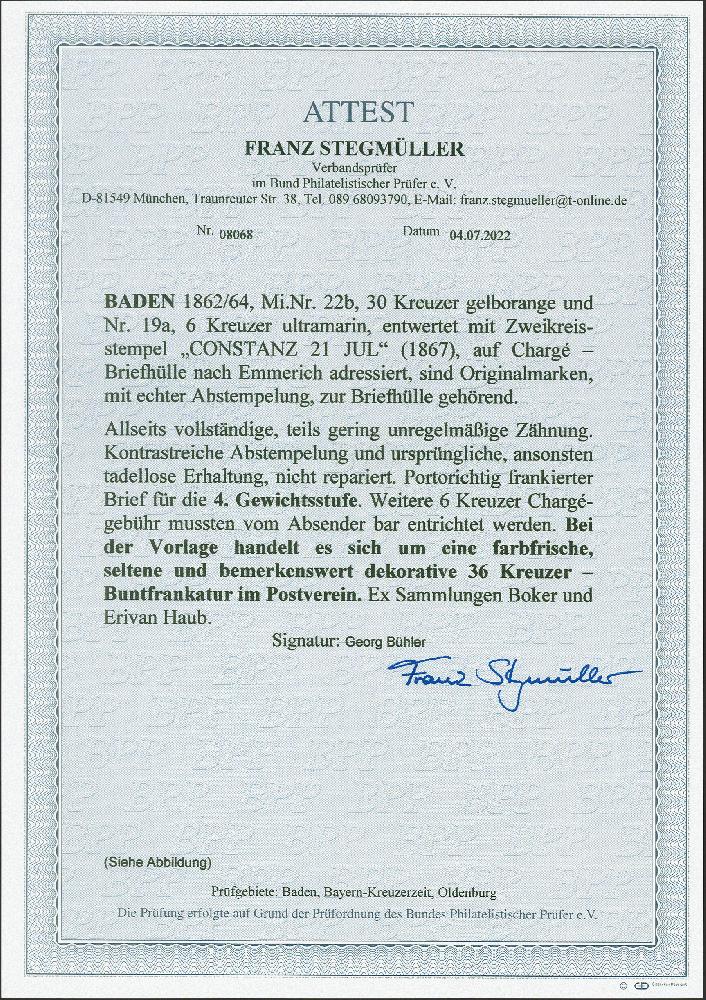 | Zusatzinformationen und Suchstichworte: | 379. Auktion Heinrich Köhler 19. - 24. September 2022 Los 20 30 Kreuzer gelborange und 6 Kreuzer ultramarin, beide farbfrisch mit vollständiger, teils gering unregelmäßige Zähnung, mit glasklar auf- und nebengesetztem kleinen Doppelkreisstempel "KONSTANZ 21 JUL" (1867) auf Charge-Briefhülle der 4. Gewichtsstufe nach Emmerich am Niederrhein. Die Hülle geringe Beförderungsspuren, sonst tadellose und sehr schöne Erhaltung. Eine attraktive und seltene Buntfrankatur mit dem Höchstwert. Signiert Georg Bühler und Fotoattest Stegmüller BPP (2022) Ausruf 5.000,00 EUR Zuschlag 13.000,00 EUR (aus der Sammlung Erivan Haub) |