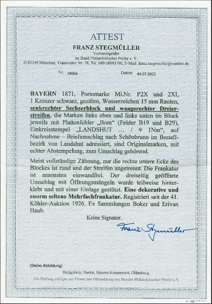| Zusatzinformationen und Suchstichworte: | 379. Auktion Heinrich Köhler 19. - 24. September 2022 Los 37 1871, 1 Kreuzer schwarz, senkrechter Sechserblock, dabei zwei Werte mit Plattenfehler "Bom", und ein getrennter 3er-Streifen, alle farbfrisch und bis auf einen verkürzten Eckzahn bei einer 1 Kreuzer gut gezähnt, mit Einkreisstempel "LANDSHUT.." auf Nachnamebrief nach Schönbrunn im eigenen Bestellbezirk. Die Frankatur sonst einwandfrei, der Briefumschlag dreiseitig geöffnet mit Öffnungsmängel, teilweise hinterklebt und mit einer Einlage gestützt. Eine attraktive und außerordentlich seltene Mehrfachfrankatur mit einem enorm seltenen Block . Fotoattest Stegmüller BPP (2022) Ausruf 6.000,00 EUR Zuschlag 9.500,00 EUR (aus der Sammlung Erivan Haub) |