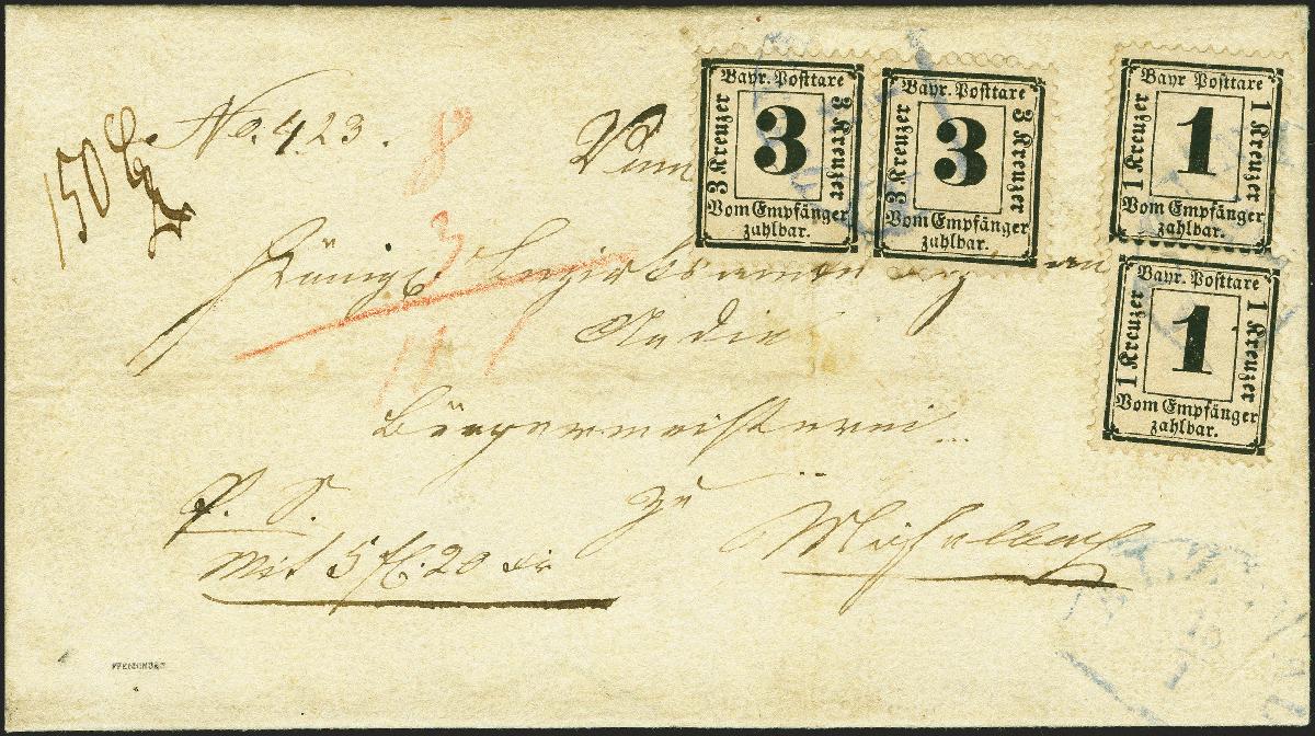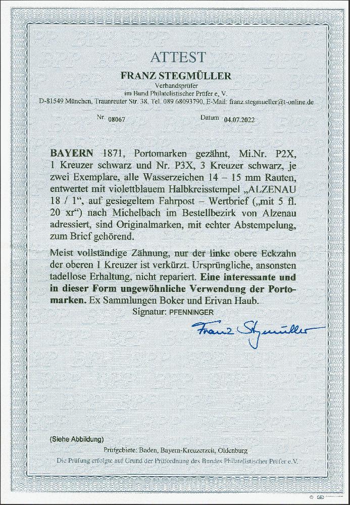 | Zusatzinformationen und Suchstichworte: | 379. Auktion Heinrich Köhler 19. - 24. September 2022 Los 38 1871, 1 Kreuzer schwarz und 3 Kreuzer schwarz, je zwei Einzelwerte, farbfrisch und bis auf einen etwas verkürzten Eckzahn bei einer 1 Kreuzer gut gezähnt, mit violettblauem Halbkreisstempel "ALZENAU 18/1" auf gesiegeltem Fahrpost-Wertbrief des Bezirksamtes, mit 5 Gulden und 20 Kreuzern nach Michelbach im eigenen Bestellbezirk. Schöne ursprüngliche und tadellose Erhaltung. Eine interessante und ungewöhnliche Verwendung der Portomarken mit seltener Frankatur Kombination. Signiert Pfenninger und Fotoattest Stegmüller BPP (2022 Ausruf 1.500,00 EUR Zuschlag 1.700,00 EUR (aus der Sammlung Erivan Haub) |