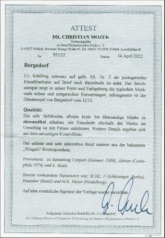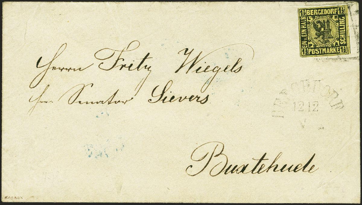| Zusatzinformationen und Suchstichworte: | 379. Auktion Heinrich Köhler 19. - 24. September 2022 Los 43 1 Schilling auf gelb, allseits breit- bis überrandig, mit sauber kreuzweise aufgesetzten Strichstempeln auf Briefkuvert der bekannten Wiegels-Korrespondenz mit leicht und sauber nebengesetztem Ortsstempel "BERGEDORF 12/12" nach Buxtehude mit Durchgangsstempel von Hamburg und Ankunftsstempel. Schöne frische und tadellose Erhaltung. Fotoattest Dr. Mozek BPP (2022) Ausruf 2.500,00 EUR Zuschlag 4.800,00 EUR (aus der Sammlung Erivan Haub) |