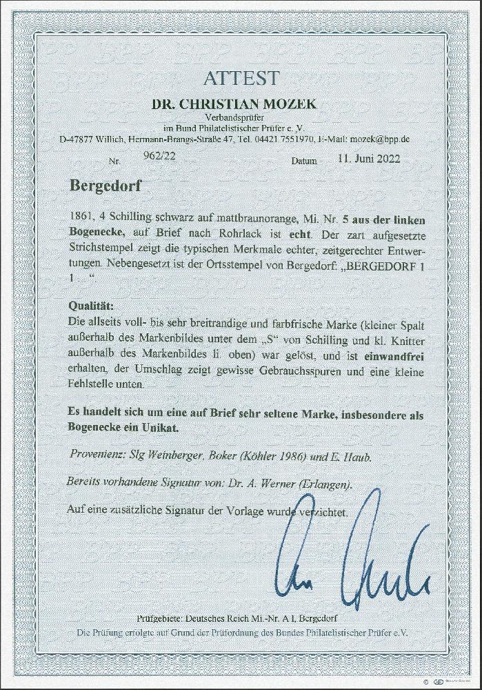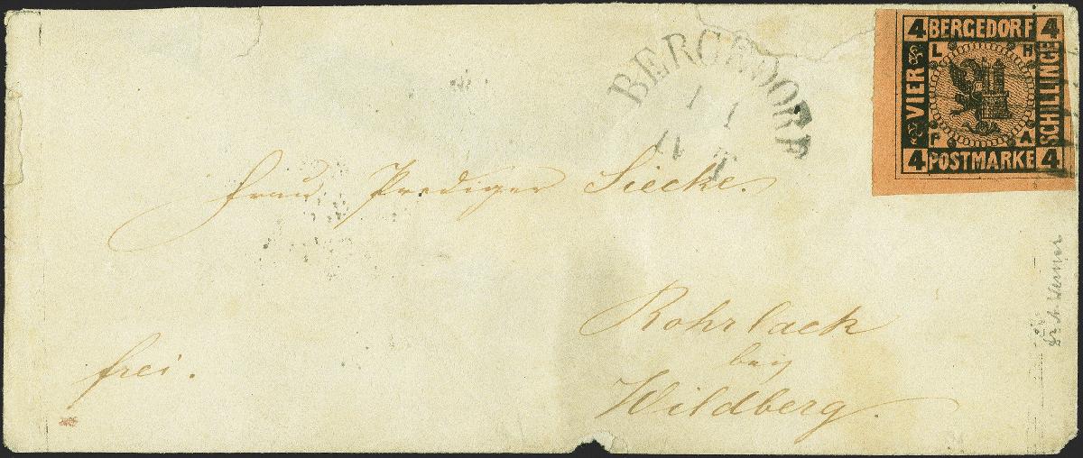 | Zusatzinformationen und Suchstichworte: | 379. Auktion Heinrich Köhler 19. - 24. September 2022 Los 44 4 Schilling auf Markt braun orange, allseits voll- bis überrandige linke untere Bogenecke mit ca. 2/3 mm Bogenrändern, mit sauber zart aufgesetztem Strichstempel und sauber nebengesetztem Ortsstempel "BERGEDORF 1/1" auf Briefkuvert nach Rohrlack bei Wildberg in Brandenburg mit rückseitigem Bahnpoststempel "HAMBURG-BERLIN" und Ausgabestempel. Das Kuvert kleine Fehlstelle unten und kleine Öffnungsmängel sowie nicht ganz komplette rückseitige Verschlussklappe, sonst einwandfreie Erhaltung. Eine der großen Briefseltenheiten der Altdeutschen Staaten, als Bogenecke Unikat. Signiert Dr. Werner und Fotoattest Dr. Mozek BPP (2022) Ausruf 10.000,00 EUR Zuschlag 28.000,00 EUR (aus der Sammlung Erivan Haub) |