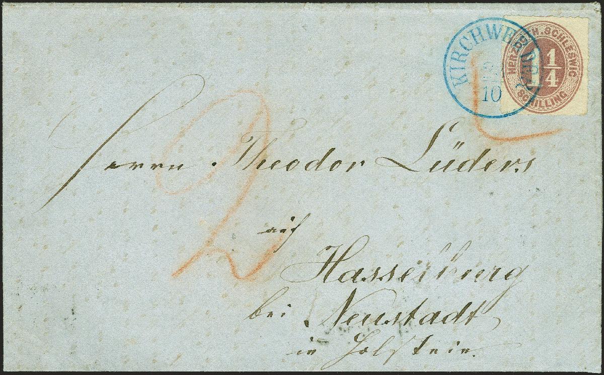 | Zusatzinformationen und Suchstichworte: | 379. Auktion Heinrich Köhler 19. - 24. September 2022 Los 46 1865, 'HERZOGTH.SCHLESWIG' 1¼ Schilling lila, farbfrisch und gut durchstochen, mit klar aufgesetztem blauen Einkreisstempel "KIRCHWERDER 23/10" auf Faltbrief nach Gut Hasselburg bei Neustadt in Holstein mit rückseitigen Durchgangsstempeln von Bergedorf und Eutin, Rahmenstempel der Bahnpost Neumünster-Neustadt sowie Ankunftsstempel. Der Brief wurde wahrscheinlich schon in Bergedorf mit "2" Schilling taxiert, da die verklebte Marke zwischen dem 1.11.1865 und 5.11.1866 nur in Schleswig gültig war. Die Marke leichte Bugspuren und das Ganzstück leichte Reinigungsspuren, sonst einwandfrei. Ein äußerst seltener und interessanter Brief aus der Korrespondenz des Pastor Lüders. Fotoattest Dr. Mozek BPP (2019) Ausruf 5.000,00 EUR Zuschlag 16.000,00 EUR (aus der Sammlung Erivan Haub) |