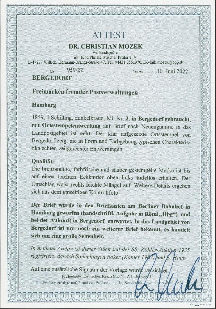 | Zusatzinformationen und Suchstichworte: | 379. Auktion Heinrich Köhler 19. - 24. September 2022 Los 49 1 Schilling braun, voll- bis breitrandig, seitlich mit Teilen der Schnittlinien, auf Briefkuvert mit leicht übergehendem Rötel-Datum und nebengesetztem Aufgabevermerk "Hbg" nach Neuengamme. Der Brief wurde am Berliner Bahnhof in Hamburg in den Bergedorfer Briefkasten eingeworfen und in Bergedorf mit dem Ortsstempel "BERGEDORF 3/9" entwertet; derselbe Stempel rückseitig als Durchgangsstempel abgeschlagen. Die Marke kleiner Eckknitter, sonst tadellos. Ein attraktiver und sehr seltener Brief; es ist nur ein weiterer über Bergedorf in das Landpostgebiet bekannt. Signiert Köhler und Fotoattest Dr. Mozek BPP (2022) Ausruf 3.000,00 EUR Zuschlag 3.400,00 EUR (aus der Sammlung Erivan Haub) |