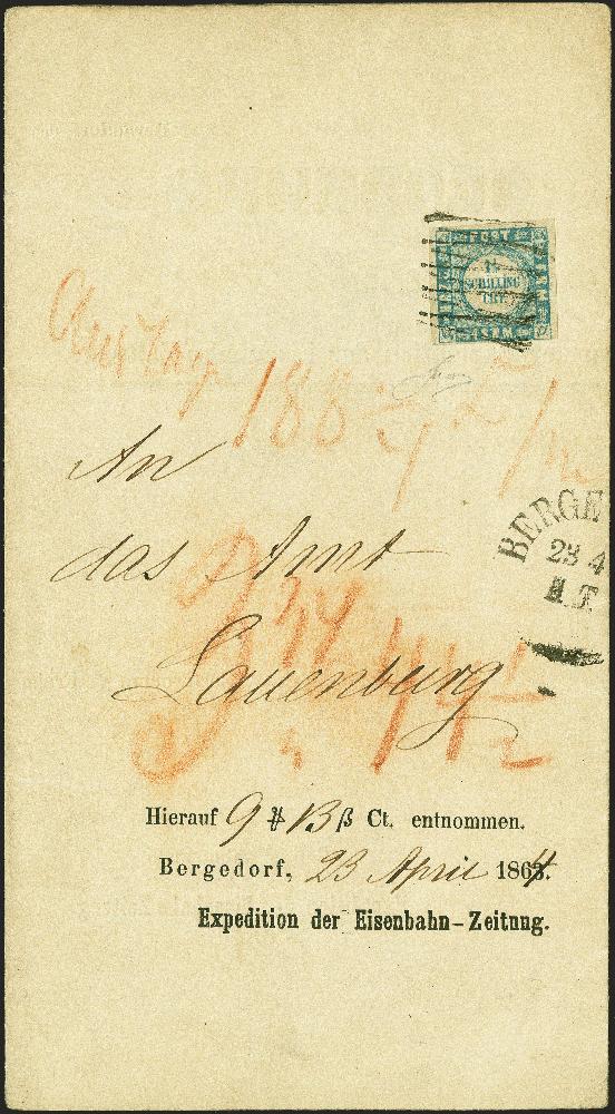 | Zusatzinformationen und Suchstichworte: | 379. Auktion Heinrich Köhler 19. - 24. September 2022 Los 51 1864, 1¼ Schilling blau, farbfrisch und voll- bis breitrandig, mit zweimal sauber aufgesetztem Strichstempel und sauber nebengesetztem Ortsstempel "BERGEDORF 23 4" auf Rechnung der Eisenbahnzeitung nach Lauenburg. Ein sehr dekoratives Stück in frischer und tadelloser Erhaltung. Fotoattest Dr. Mozek BPP (2022) Ausruf 1.000,00 EUR Zuschlag 2.000,00 EUR (aus der Sammlung Erivan Haub) |