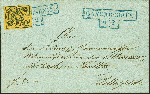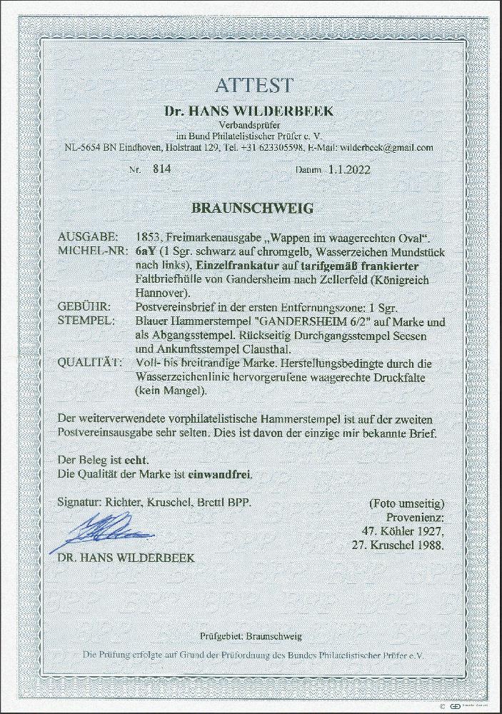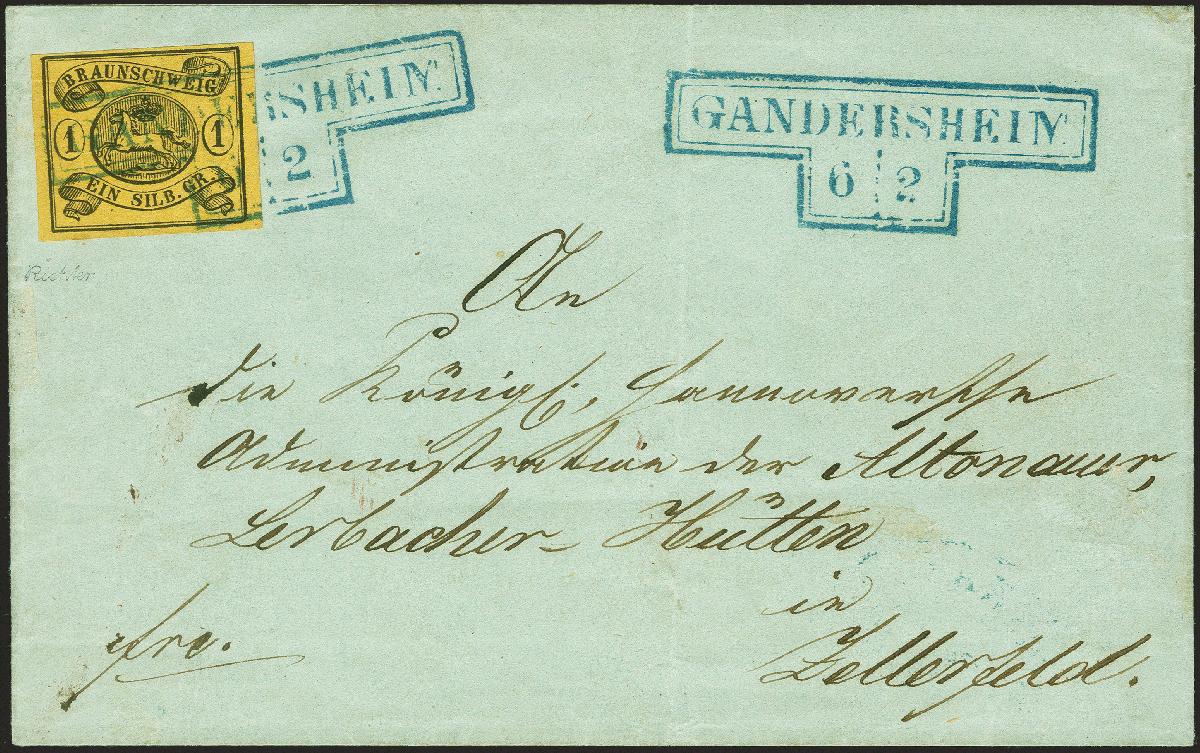 | Zusatzinformationen und Suchstichworte: | 379. Auktion Heinrich Köhler 19. - 24. September 2022 Los 52 1 Silbergroschen chromgelb mit Wasserzeichen 'Mundstück nach links', sehr schöne tiefe Farbe und voll- bis meist breitrandig, mit sauber auf- und nebengesetztem blauem 'Hammerstempel' "GANDERSHEIM 6/2" auf Briefhülle nach Zellerfeld im Königreich Hannover. Sehr schöne frische und einwandfreie Erhaltung. Der Hammerstempel von Gandersheim ist auf Brief außerordentlich selten; von der 2. Ausgabe ist kein weiterer bekannt. Signiert Richter, Kruschel und Brettl BPP, Fotoattest Dr. Wilderbeek BPP (2022) Ausruf 1.500,00 EUR Zuschlag 9.000,00 EUR (aus der Sammlung Erivan Haub) |