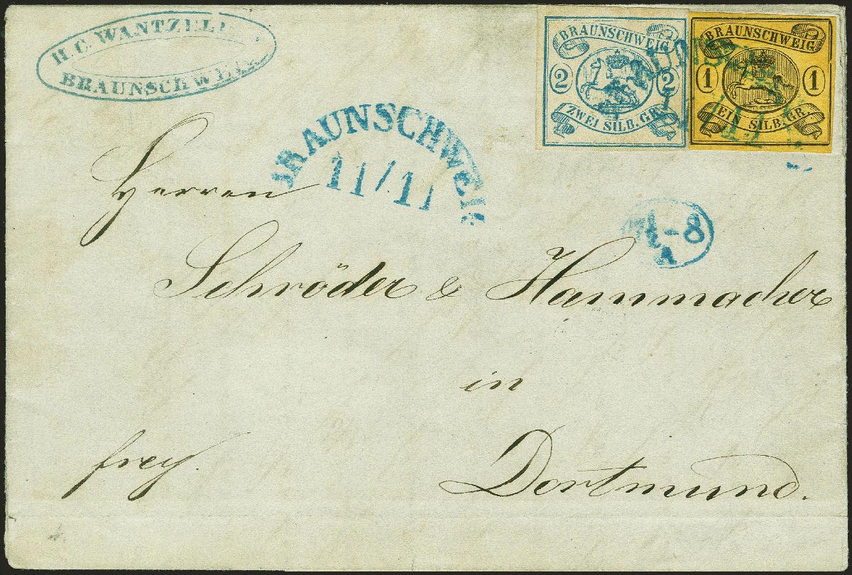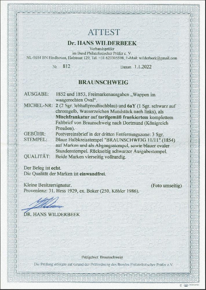 | Zusatzinformationen und Suchstichworte: | 379. Auktion Heinrich Köhler 19. - 24. September 2022 Los 53 1 Silbergroschen chromgelb mit Wasserzeichen 'Mundstück nach links' in Mischfrankatur mit 1852, 2 Silbergroschen lebhaftpreußischblau, beide farbfrisch und voll- bis breitrandig, mit sauber auf- und nebengesetztem blauem Halbkreisstempel "BRAUNSCHWEIG 11/11" (1854) auf Faltbrief nach Dortmund. Die Marken einwandfrei, die Briefhülle an einigen Stellen in den Faltungen etwas angetrennt. Eine attraktiver Mischfrankatur. Fotoattest Dr. Wilderbeek BPP (2022) Ausruf 1.000,00 EUR (aus der Sammlung Erivan Haub) |