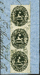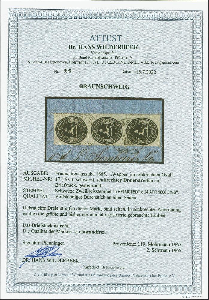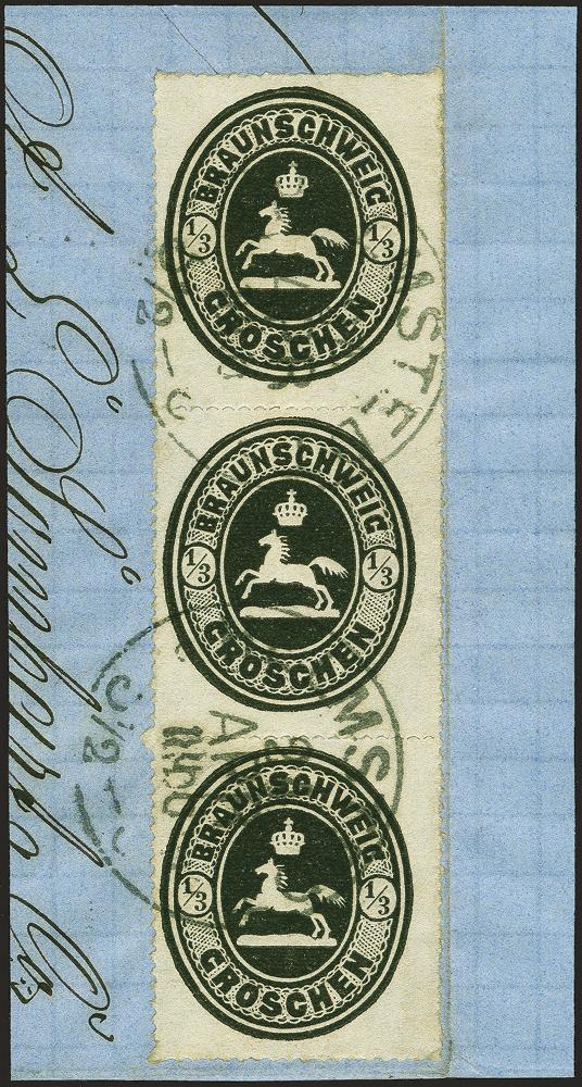 | Zusatzinformationen und Suchstichworte: | 379. Auktion Heinrich Köhler 19. - 24. September 2022 Los 59 1865, ⅓ Groschen schwarz im senkrechten 3er-Streifen, farbfrisch und einwandfrei durchstochen, mit zweimal sauber aufgesetztem schwarzen Doppelkreisstempel "HELMSTEDT 24 APR. 1866" auf Briefstück. Sehr schöne und tadellose Erhaltung. 3er Streifen dieser Marke sind sehr selten, in senkrechter Form haben wir nur einen weiteren registriert. Fotoattest Dr. Wilderbeek BPP (2022) Ausruf 800,00 EUR Zuschlag 2.000,00 EUR (aus der Sammlung Erivan Haub) |