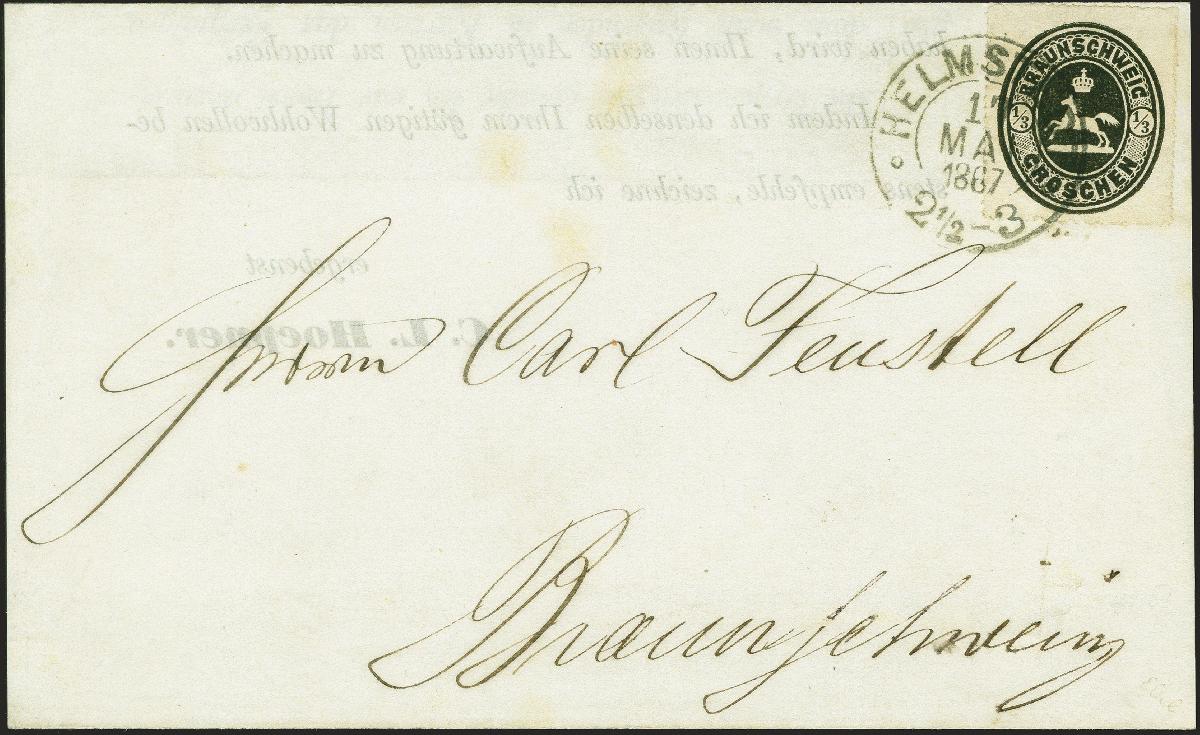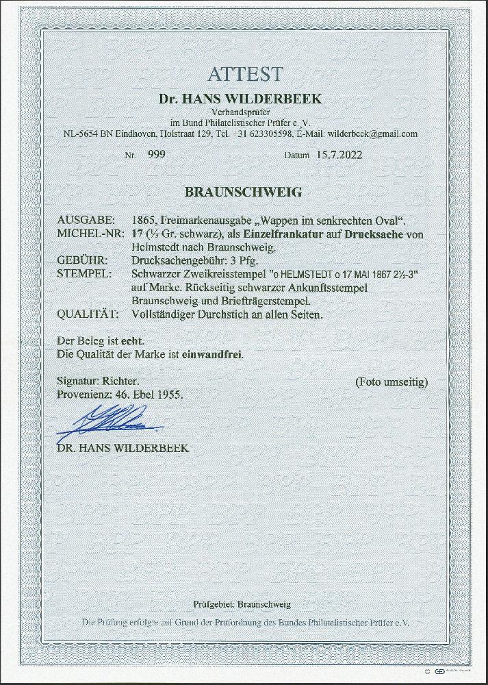 | Zusatzinformationen und Suchstichworte: | 379. Auktion Heinrich Köhler 19. - 24. September 2022 Los 60 1865, ⅓ Groschen schwarz, farbfrisch und einwandfrei durchstochen, mit sauber aufgesetztem Doppelkreisstempel "HELMSTEDT 17 Mai 1867" auf Drucksache nach Braunschweig mit Ausgabestempel. Eine attraktive Einzelfrankatur, die außerhalb Braunschweigs nur wenige Male registriert ist. Fotoattest Dr. Wilderbeek BPP (2022) Ausruf 1.000,00 EUR Zuschlag 4.600,00 EUR (aus der Sammlung Erivan Haub) |