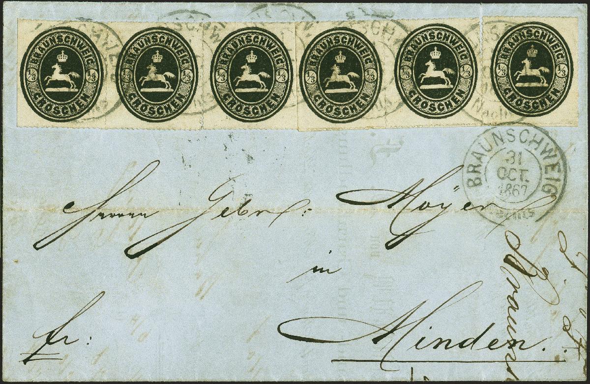 | Zusatzinformationen und Suchstichworte: | 379. Auktion Heinrich Köhler 19. - 24. September 2022 Los 61 1865, ⅓ Groschen schwarz, waagerechter 3er Streifen (eine Marke fast abgetrennt), Paar und Einzelmarke, alle farbfrisch und meist einwandfrei durchstochen, lediglich zwei Werte Scherentrennung, mit sauber aufgesetztem Doppelkreisstempel "BRAUNSCHWEIG 31 OCT 1867" auf Faltbrief nach Minden mit Ausgabestempel. Eine einmalige Mehrfachfrankatur in sonst einwandfreier Erhaltung. Fotoattest Dr. Wilderbeek BPP (2022) Ausruf 5.000,00 EUR Zuschlag 17.000,00 EUR (aus der Sammlung Erivan Haub) |