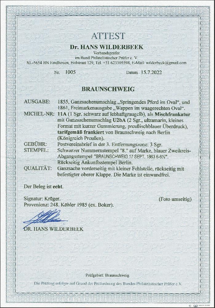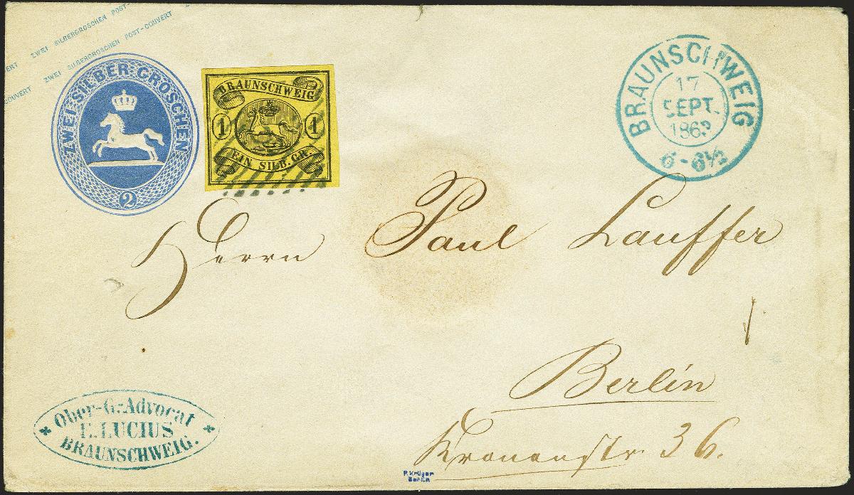 | Zusatzinformationen und Suchstichworte: | 379. Auktion Heinrich Köhler 19. - 24. September 2022 Los 63 1855, Ganzsachenumschlag 2 Silbergroschen ultramarin im Kleinformat, mit Zufrankatur 1861, 1 Silbergroschen schwarz auf gelb, voll- bis breitrandig, mit Nummer "8" und nebengesetztem blauen Doppelkreisstempel "BRAUNSCHWEIG 17 SEPT. 1862" nach Berlin mit Ausgabestempel. Der Umschlag oben winziges Rißchen, sonst schöne und tadellose Erhaltung. Fotoattest Dr. Wilderbeek BPP (2022). Ausruf 200,00 EUR Zuschlag 500,00 EUR (aus der Sammlung Erivan Haub) |