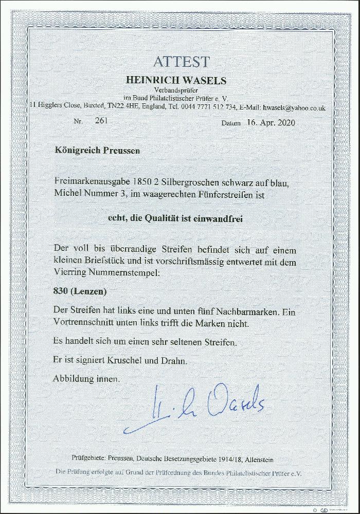 | Zusatzinformationen und Suchstichworte: | 374. Auktion Heinrich Köhler Auktionstermin 27.06.2020 Los 153 2 Silbergroschen schwarz auf blau im waagerechten 5er-Streifen, rechts oben voll- sonst allseits breit- bis überrandig, unten mit Teilen von 5 Nachbarmarken, mit Nummer "830" LENZEN auf Briefstück. Ein seltener Streifen in einwandfreier Erhaltung. Signiert Kruschel und Drahn, Fotoattest Wasels BPP (2020) (Mi.-Nr. 3) Ausruf 500,00 EUR Zuschlag 900,00 EUR (aus der Sammlung Erivan Haub) |