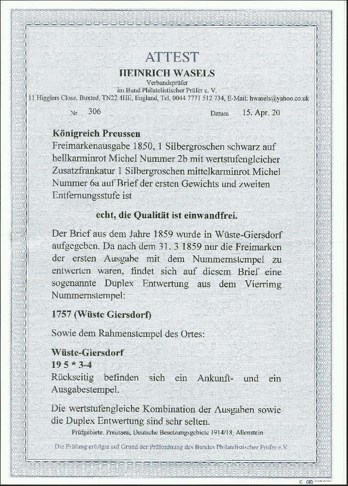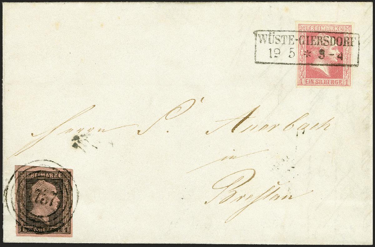 | Zusatzinformationen und Suchstichworte: | 374. Auktion Heinrich Köhler Auktionstermin 27.06.2020 Los 167 1 Silbergroschen rosa, farbfrisch und voll- bis breitrandig mit glasklar aufgesetzem Rahmenstempel "WÜSTE-GIERSDORF 19 5", in wertstufengleicher Mischfrankatur mit 1850, Gittergrund 1 Silbergroschen auf hellkarminrot, voll- bis breitrandig und mit für diese Marke vorgeschriebener Nummernstempelentwertung "1757" auf komplettem Faltbrief nach Breslau. Ein seltenes und außerordentlich attraktives Stück. Fotoattest Wasels BPP (2020) Ausruf 1.000,00 EUR Zuschlag 1.600,00 EUR (aus der Sammlung Erivan Haub) |