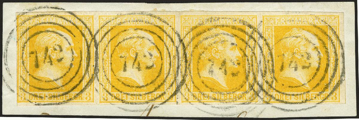 | Zusatzinformationen und Suchstichworte: | 374. Auktion Heinrich Köhler Auktionstermin 27.06.2020 Los 171 1857, Glatter Grund 3 Silbergroschen orangegelb im waagerechten 4er-Streifen, farbfrisch, links noch voll- sonst meist breitrandig, mit Nummer "742" KÖNIGSBERG auf Briefstück. Minimale senkrechte Knitterspur, sonst einwandfrei. Ein attraktiver und außerordentlich seltener Streifen. Signiert Drahn und Kruschel, Fotoattest Wasels BPP (2020). (Mi.-Nr. 8b) Ausruf 800,00 EUR Zuschlag 800,00 EUR (aus der Sammlung Erivan Haub) |