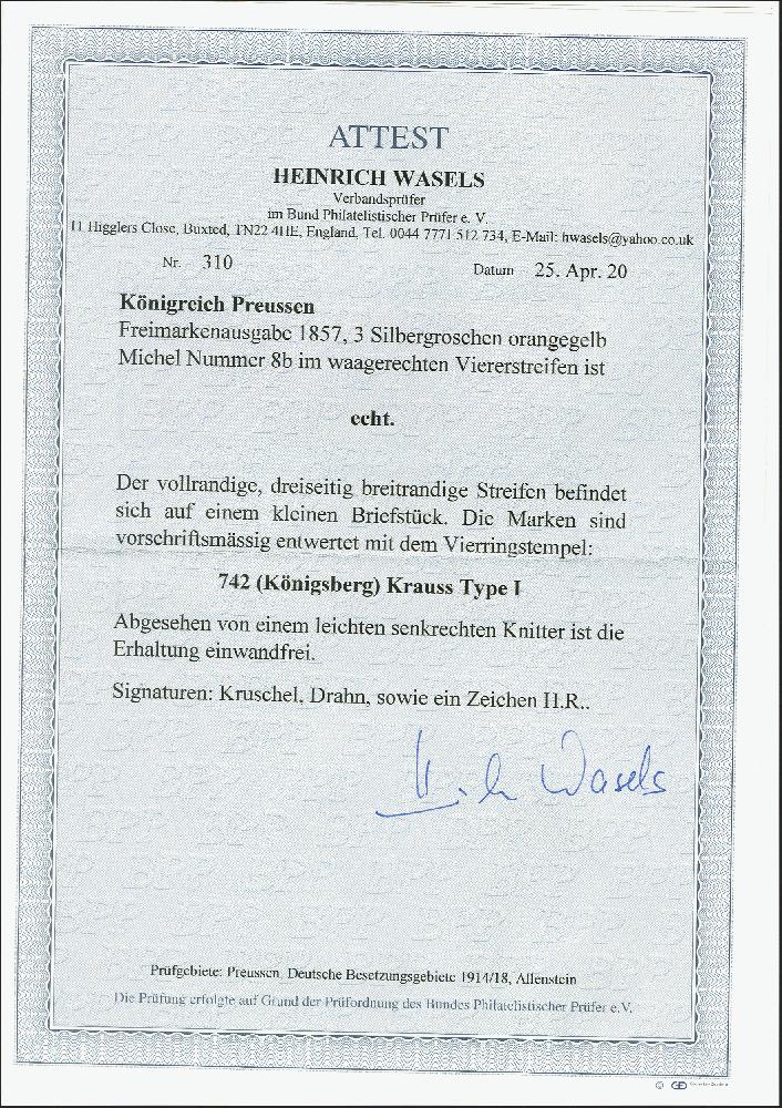 | Prüfer: | Wasels, Heinrich (BPP (Bund Philatelistischer Prüfer)) |