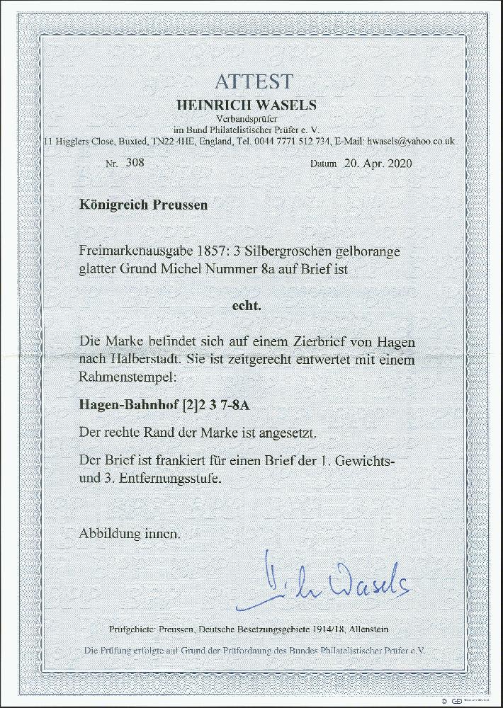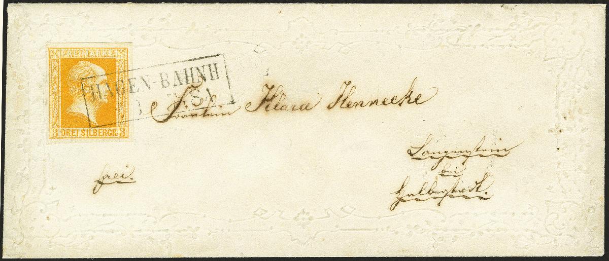 | Zusatzinformationen und Suchstichworte: | 374. Auktion Heinrich Köhler Auktionstermin 27.06.2020 Los 172 3 Silbergroschen gelborange, sehr farbfrisch, der rechte Rand ergänzt, sonst breitrandig, mit sauber aufgesetztem Rahmenstempel "HAGEN-BAHNH. 22/3" auf Damenkuvert mit breiter, farblos geprägter Zierborde nach Halberstadt. Sehr dekoratives Stück. Fotoattest Wasels BPP (2020) (Mi.-Nr. 8a) Ausruf 300,00 EUR Zuschlag 300,00 EUR (aus der Sammlung Erivan Haub) |