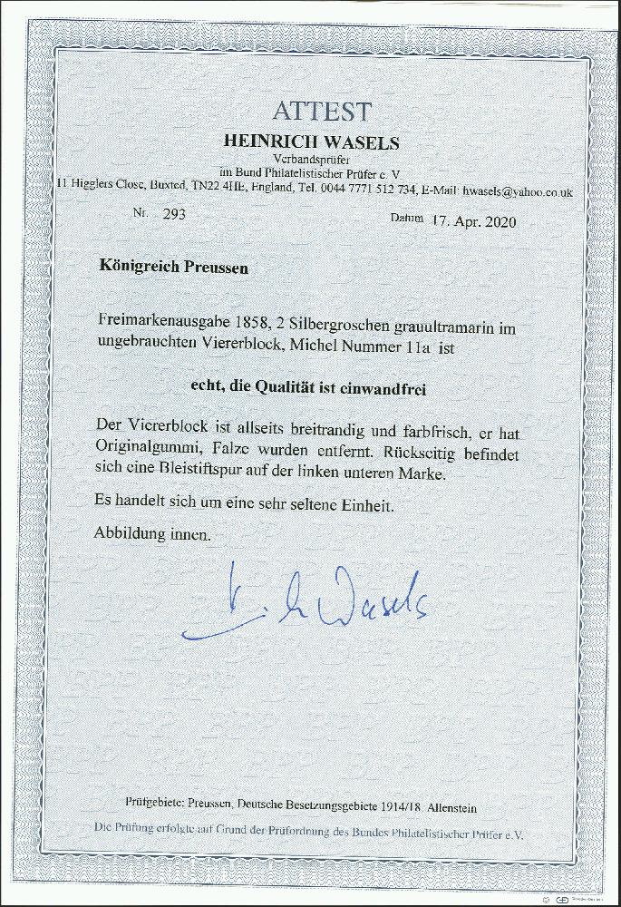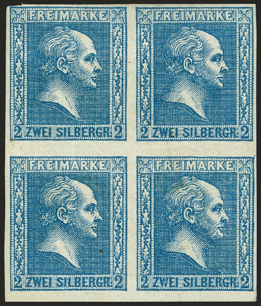 | Zusatzinformationen und Suchstichworte: | 374. Auktion Heinrich Köhler Auktionstermin 27.06.2020 Los 175 2 Silbergroschen grauultramarin im 4er-Block, farbfrisch und voll- bis breitrandig geschnitten, ungebraucht mit frischem Originalgummi; auf der linken unteren Marke rückseitig kleine Bleistiftnotierung. Eine seltene Einheit in einwandfreier Erhaltung. Fotoattest Wasels BPP (2020) (Mi.-Nr. 11a) Ausruf 1.000,00 EUR Zuschlag 1.300,00 EUR (aus der Sammlung Erivan Haub) |