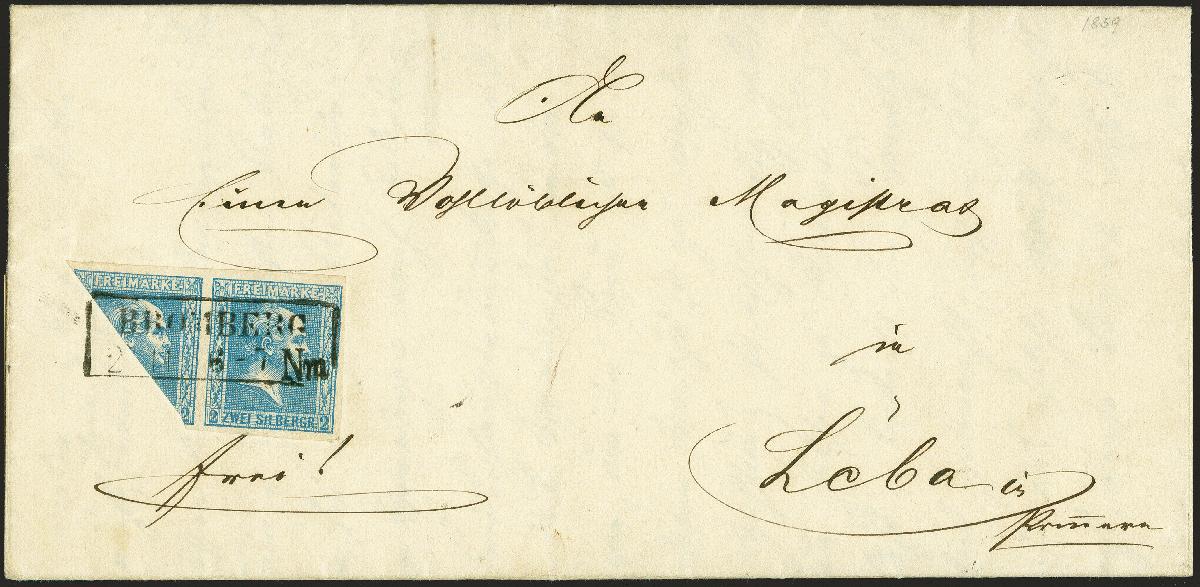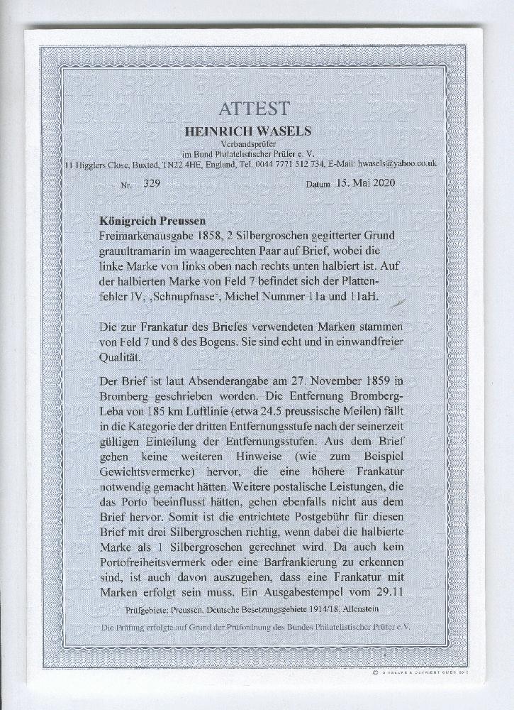 | Zusatzinformationen und Suchstichworte: | 374. Auktion Heinrich Köhler Auktionstermin 27.06.2020 Los 184 1858, Gittergrund 2 Silbergroschen blau diagonal halbiert, rechte obere Hälfte im waagerechten Paar mit ganzer Marke, farbfrisch und allseits breitrandig mit sauber aufgesetztem Rahmenstempel "BROMBERG 2 .. 11 6-7 Nm" als portogerechte 3 Silbergroschen-Frankatur auf komplettem Faltbrief (datiert 27.11.1859) an den Magistrat von Leba in Pommern mit Ausgabestempel vom 29.11.. Besonders frische, ursprüngliche und tadellose Erhaltung. Bei diesem Brief handelt es sich um eine der größten Seltenheiten der Preußen-Philatelie; es ist die einzige Halbierung auf vollständigem Brief, die unbeanstandet befördert wurde. Im Gegensatz zu anderen altdeutschen Staaten in den die Verwendung von Halbierungen entweder zugelassen oder geduldet wurde, wie zum Beispiel in Schleswig-Holstein, Bayern oder Braunschweig bzw. verboten waren wie zum Beispiel in Sachsen, gibt es von der preußischen Post weder amtliche Verordnungen über den Gebrauch noch Hinweise auf die Duldung von Halbierungen (siehe Preußen-Handbuch 01-15-01). Ein ganz außergewöhnliches Stück. Fotoattest Wasels BPP (2020). (Mi.-Nr. 11H) Ausruf 50.000,00 EUR Zuschlag 130.000,00 EUR (aus der Sammlung Erivan Haub) |