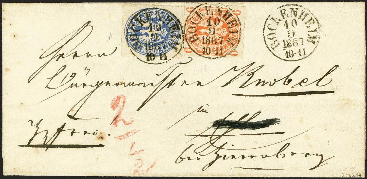 | Zusatzinformationen und Suchstichworte: | 374. Auktion Heinrich Köhler Auktionstermin 27.06.2020 Los 190 6 Pfennig orange und 2 Silbergroschen ultramarin mit klar auf- und nebengesetztem Taxis-Einkreisstempel "BOCKENHEIM 10 9 1867" auf kleiner Briefhülle an den Bürgermeister Knobel von Ehlen bei Zierenberg (das "Ehlen" in der Adresse möglicherweise auf dem Postweg gestrichen) mit rückseitigem Landpost-Rahmenstempel "ZIERENBERG/DÖRNBERG" mit handschriftlichem Datum "11/9". Ein attraktiver und seltener Brief mit vorausbezahltem Landpost-Bestellgeld. Signiert Bartels und Georg Bühler, Fotoattest Wasels BPP (2020) (Mi.-Nr. 15a, 17a) Ausruf 200,00 EUR Zuschlag 280,00 EUR (aus der Sammlung Erivan Haub) |