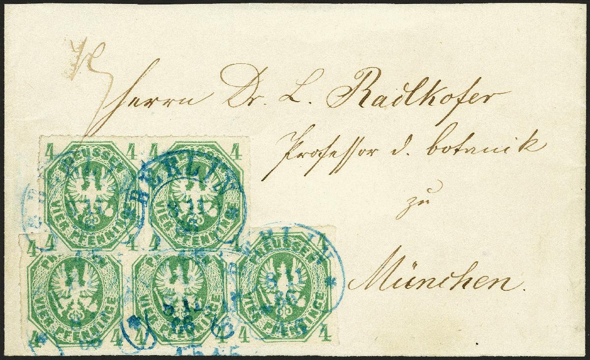 | Zusatzinformationen und Suchstichworte: | 374. Auktion Heinrich Köhler Auktionstermin 27.06.2020 Los 191 1861, Wappen 4 Pfennig gelblichgrün, waagerechter 3er-Streifen und waagerechtes Paar, sehr schön farbfrisch und abgesehen von kleinen Durchstichmängeln einwandfrei, mit mehrfach aufgesetztem blauen Hufeisenstempel "BERLIN 8 11 66" auf Streifband der 5. Gewichtsstufe nach München mit rückseitigem Ankunftsstempel vom nächsten Tag. Eine sehr attraktive und außerordentlich seltene Drucksache, wir haben keine weitere derartige portogerechte Mehrfachfrankatur registriert. Fotoattest Wasels BPP (2020) (Mi.-Nr. 14a) Ausruf 300,00 EUR Zuschlag 3.200,00 EUR (aus der Sammlung Erivan Haub) |