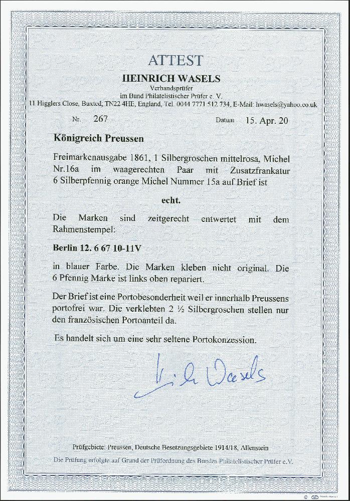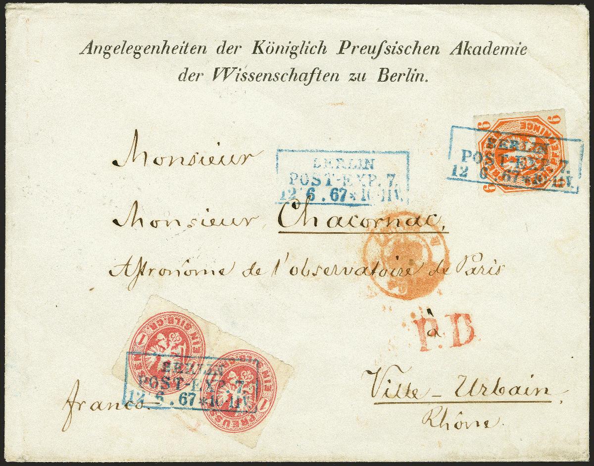 | Zusatzinformationen und Suchstichworte: | 374. Auktion Heinrich Köhler Auktionstermin 27.06.2020 Los 194 6 Pfennige lebhaftorange und 1 Silbergroschen rosa im waagerechten Paar mit blauem Rahmenstempel "BERLIN POST-EXP.7 12 6 67" auf Briefkuvert mit vorgedrucktem Absender-Vermerk "Angelegenheiten der königlich preußischen Akademie der Wissenschaften zu Berlin" nach Villeurbanne bei Lyon, Frankreich mit handschriftlichem Vermerk "franco" und vorderseitigem roten "P.D." sowie diversen Transitstempeln vorder- und rückseitig. Die linke obere Ecke der 6 Pfennig unmerklich verschönert, sonst einwandfreie Erhaltung. Es handelt sich hier um einen außerordentlich seltenen Auslandsbrief, bei dem der Absender im Inland Portofreiheit genoss und daher nur das Weiterfranko von 2½ Silbergroschen frankiert werden mußte. Fotoattest Wasels BPP (2020) (Mi.-Nr. 15a, 16a) Ausruf 500,00 EUR Zuschlag 1.200,00 EUR (aus der Sammlung Erivan Haub) |