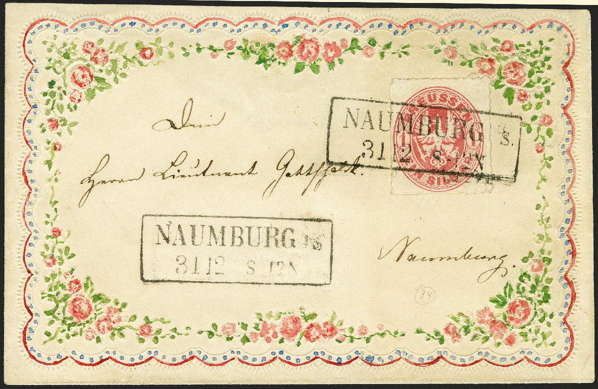 | Zusatzinformationen und Suchstichworte: | 374. Auktion Heinrich Köhler Auktionstermin 27.06.2020 Los 197 1 Silbergroschen rosa, farbfrisch und gut durchstochen mit Rahmenstempel "NAUMBURG A.S. 31 12", zusätzlich nebengesetzt, auf handcoloriertem Prägedruck-Zierkuvert als Silvesterbrief im Ort gelaufen mit rückseitigem Ausgabestempel. Der Stempel ist aus optischen Gründen etwas nachgemalt, die rückseitige Verschlußklappe fehlt. Ein äußerst attraktiver Brief, der Zeitpunkt der farbigen Bemalung nicht sicher. Signiert Meier BPP und Fotoattest Wasels BPP (2020) Ausruf 300,00 EUR Zuschlag 600,00 EUR (aus der Sammlung Erivan Haub) |