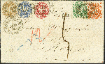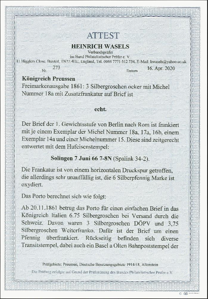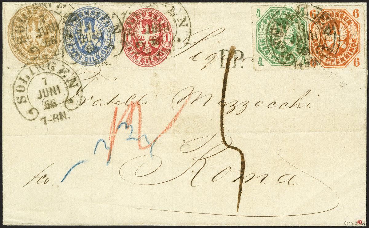 | Zusatzinformationen und Suchstichworte: | 374. Auktion Heinrich Köhler Auktionstermin 27.06.2020 Los 204 1861/65, Wappenausgabe 3 Silbergroschen ocker, 2 Silbergroschen ultramarin,1 Silbergroschen rosakarmin, 4 Pfennige grün und 6 Pfennige orange, letztere etwas oxidiert, sonst alle farbfrisch und gut durchstochen, mit Hufeisenstempel "SOLINGEN 7 JUNI 66" (Spalink 34-2) als portogerechte 6 3/4 Silbergroschen-Frankatur auf Briefhülle über die Schweiz nach Rom im Kirchenstaat. Der Brief ist portogerecht frankiert mit 3 Silbergroschen Vereinsporto, 2 Silbergroschen Schweizer Transit sowie 1 3/4 Silbergroschen italienischem Anteil bis zur Grenze des Kirchenstaates. Das Inlandsporto des Kirchenstaates in Höhe von "5" Bajochi wurden vom Empfänger eingezogen. Die Frankatur zeigt am Oberrand eine leichte, wohl inhaltsbedingte Druckspur, sonst gute und frische Erhaltung. Eine attraktive und sehr seltene Fünffarbenfrankatur der kompletten Ausgabe von 1861. Signiert Georg Bühler, Metzer und Kruschel sowie Fotoattest Wasels BPP (2020) (Mi.-Nr. 14-18) Ausruf 1.000,00 EUR Zuschlag 6.000,00 EUR (aus der Sammlung Erivan Haub) |