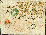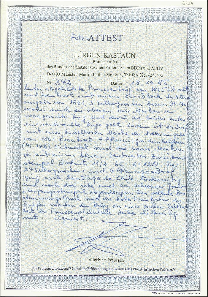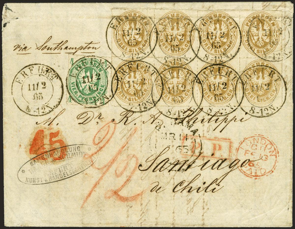 | Zusatzinformationen und Suchstichworte: | 374. Auktion Heinrich Köhler Auktionstermin 27.06.2020 Los 205 3 Silbergroschen ockerbraun im waagerechten 8er-Block zusammen mit 4 Pfennige grün, alle farbfrisch und mit guten Durchstich, mit auf jeder Marke einzeln aufgesetztem Doppelkreisstempel "ERFURT 11/2 65", zusätzlich nebengesetzt, auf komplettem Faltbrief über Köln, England und Panama (Transitstempel vorder- bzw. rückseitig) nach Santiago de Chile. Der Brief ist nach dem Tarif vom 1. Januar 1863 portogerecht frankiert mit 24¼ Silbergroschen (die 1 Pfennig Überfrankatur war unabdinglich, da der 3 Pfennig-Wert erst am 1.4.1865 eingeführt wurde). Die Frankatur war ursprünglich oben um den Rand des Briefes herumgeklebt, dieser jetzt etwas umgefaltet; durch das linke senkrechte Paar des Blockes verläuft eine leichte Bugspur, sonst sehr schöne und frische Erhaltung, insbesondere für diese Destination. Ein einmaliger Auslandsbrief mit sowohl seltener Blockeinheit als auch Destination. Signiert Kastaun BPP mit Attest (1985) (Mi.-Nr. 18a, 14) Ausruf 2.000,00 EUR Zuschlag 4.400,00 EUR (aus der Sammlung Erivan Haub) |