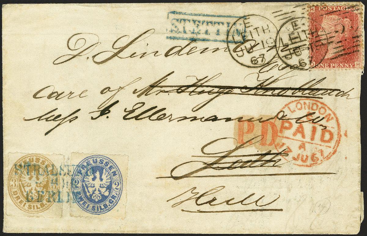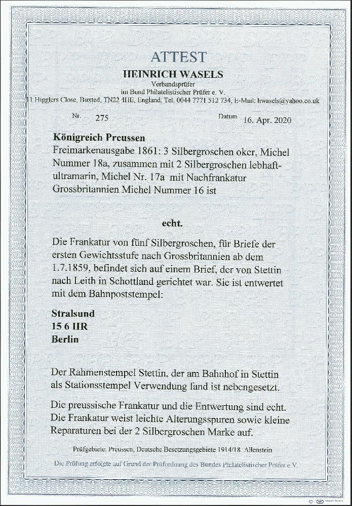 | Zusatzinformationen und Suchstichworte: | 374. Auktion Heinrich Köhler Auktionstermin 27.06.2020 Los 207 2 Silbergroschen ultramarin und 3 Silbergroschen ocker mit blauem Bahnpost-Streckenstempel "STRALSUND / 15 6 / BERLIN" und nebengesetztem Stationsstempel "STETTIN" auf nicht ganz kompletter Briefhülle an eine c/o-Adresse in Leith, England, nachgesandt nach Hull, frankiert mit 1858/69, 1 Penny lilarot, entwertet durch Duplex-Stempel "LEITH JU 19 67". Die 2 Silbergroschen mit kleinen Reparaturen, sonst bis auf leichte Altersspuren gute Erhaltung. Ein attraktiver und interessanter Brief. Fotoattest Wasels BPP (2020) (Mi.-Nr. 17a, 18a+GB 16) Ausruf 300,00 EUR Zuschlag 1.400,00 EUR (aus der Sammlung Erivan Haub) |