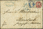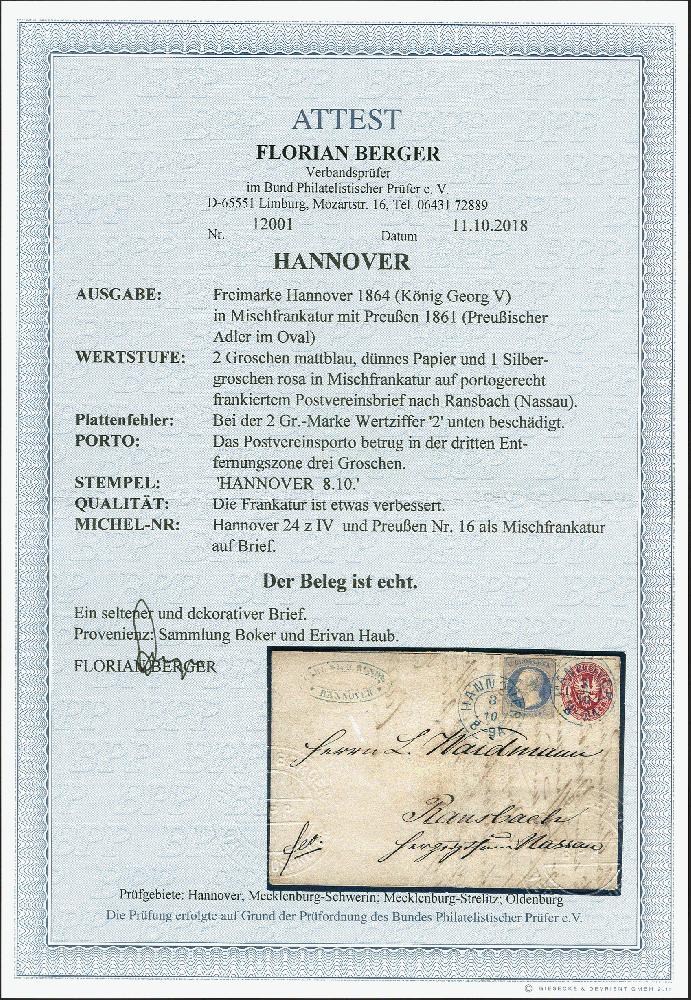 | Zusatzinformationen und Suchstichworte: | 374. Auktion Heinrich Köhler Auktionstermin 27.06.2020 Los 208 1861, Wappen 1 Silbergroschen rosa in portogerechter Mischfrankatur mit Hannover 1864, 2 Groschen mattblau, mit klarem blauen Doppelkreisstempel "HANNOVER 3/10" (1866) auf komplettem Faltbrief nach Ransbach im Herzogtum Nassau mit rückseitigen Transit- und Ankunftsstempeln. Bei beiden Werten die äußere rechte untere Ecke etwas ergänzt, sonst einwandfrei. Eine sehr seltene und attraktive Mischfrankatur, eine der wenigen wirklich korrekten Kombinationen aus der Zeit nach der preußischen Besetzung in der die Marken Hannovers noch bis zum 31.10.1866 ihre Frankaturgültigkeit behielten. Fotoattest Berger BPP (2018) (Mi.-Nr. 16+Hannover 24z) Ausruf 2.000,00 EUR Zuschlag 5.500,00 EUR (aus der Sammlung Erivan Haub) |