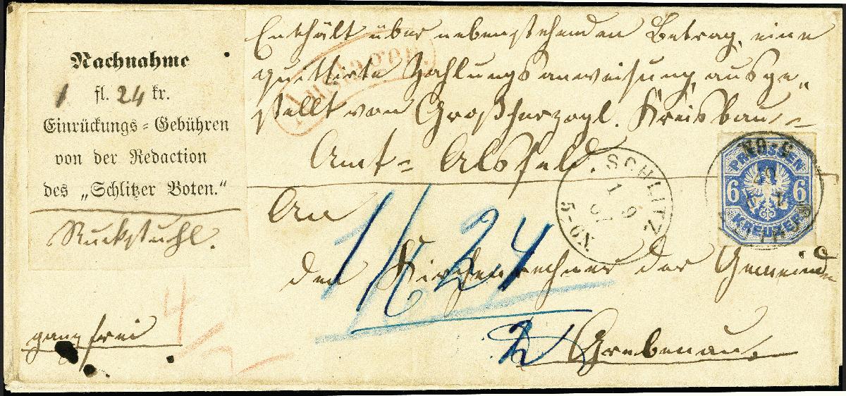 | Zusatzinformationen und Suchstichworte: | 374. Auktion Heinrich Köhler Auktionstermin 27.06.2020 Los 221 6 Kreuzer ultramarin, farbfrisch und gut durchstochen mit Grotesk-Einkreisstempel "SCHLITZ 1/9 67" auf Auslagen-Briefhülle mit vorderseitigem weißen Nachnahme-Zettel des 'Schlitzer Boten' nach Grebenau. Eine interessante und in dieser Form seltene Einzelfrankatur. Fotoattest Flemming BPP (1994) (Mi.-Nr. 25a) Ausruf 150,00 EUR Zuschlag 1.000,00 EUR (aus der Sammlung Erivan Haub) |