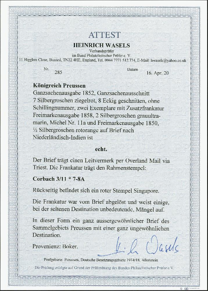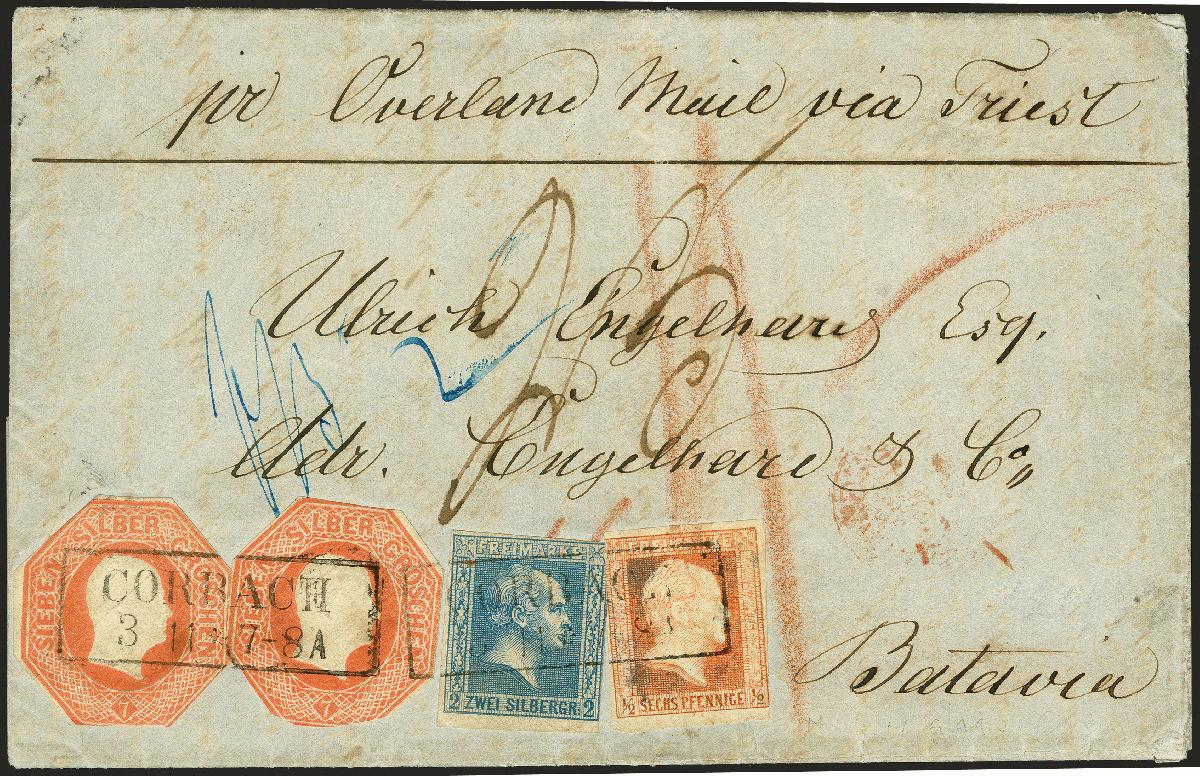 | Zusatzinformationen und Suchstichworte: | 374. Auktion Heinrich Köhler Auktionstermin 27.06.2020 Los 229 1862, Oktogon-Ausgabe, 2 Ganzsachenausschnitte 7 Silbergroschen ziegelrot, achteckig geschnitten, zusammen mit 1850, ½ Silbergroschen rotorange und 1858, 2 Silbergroschen grauultramarin mit paarweise aufgesetztem Rahmenstempel "CORBACH 3 11" auf vollständigem, aber undatiertem Faltbrief 'pr Overland Mail via Triest' nach Batavia in Niederländisch Indien. Rückseitig Durchgangsstempel von Singapur sowie handschriftlicher Portovermerk "52/15". Die Frankatur ist teils berührt, die ½ Silbergroschen etwas oxidiert. Der Brief ist bezahlt und frankiert bis Singapur mit 3 Silbergroschen Vereinsporto, 3 Silbergroschen österreichischem Seeporto bis Alexandria und 10½ Silbergroschen Weiterfranko für die Strecke jenseits von Alexandria, letzterer Anteil mit "1/-" in Rötel vorderseitig notiert. Das Porto für den Transport von Singapur bis Batavia mit niederländischem Schiff in Höhe von "25" Cents wurde vom Empfänger eingezogen. Ein außerordentlich seltener und attraktiver Ostasien-Brief in für diesen Transportweg guter Erhaltung. Signiert Kruschel und Thier, Fotoattest Wasels BPP (2020) (Mi.-Nr. GAA7+1+11a) Ausruf 4.000,00 EUR Zuschlag 11.000,00 EUR (aus der Sammlung Erivan Haub) |