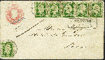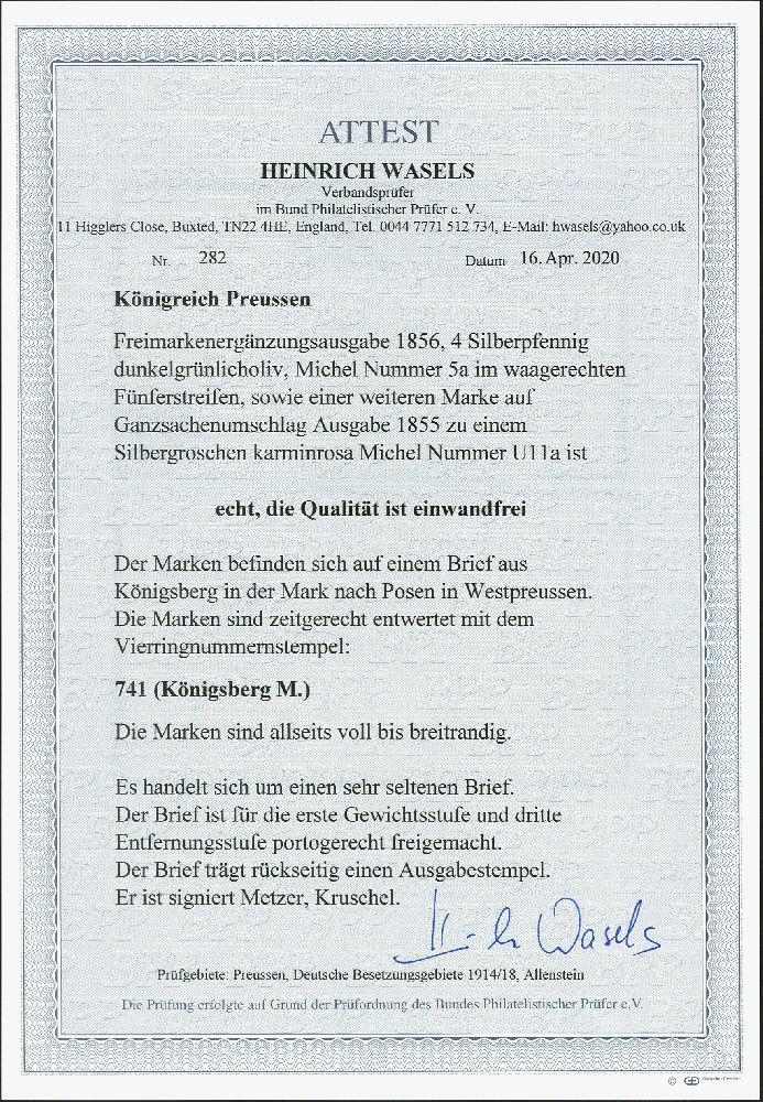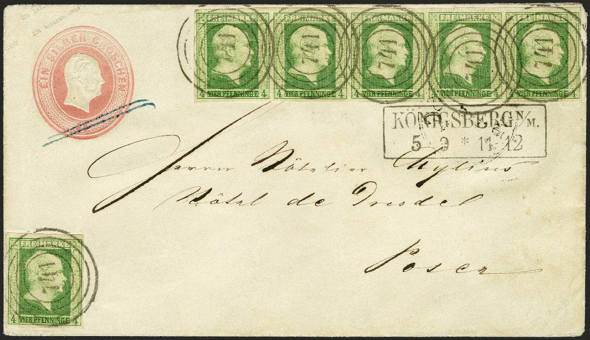 | Zusatzinformationen und Suchstichworte: | 374. Auktion Heinrich Köhler Auktionstermin 27.06.2020 Los 233 1855, Umschlag 1 Silbergroschen blassrosa mit Zufrankatur 1856, 4 Pfennige grün, waagerechter 5er-Streifen und Einzelstück, alle in schöner frischer Farbe und voll- bis meist breitrandig, mit einzeln glasklar aufgesetzter Nummer "741" und nebengesetztem Rahmenstempel "KÖNIGSBERG N/M. 5 9" nach Posen mit rückseitigem Ausgabestempel. Ein phantastischer Brief mit einem seltenen Streifen in einmaliger Frankaturkombination. Altbekanntes Stück. Signiert Kruschel und Metzer, Fotoattest Wasels BPP (2020) (Mi.-Nr. U11a+5a) Ausruf 4.000,00 EUR Zuschlag 11.000,00 EUR (aus der Sammlung Erivan Haub) |