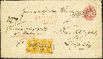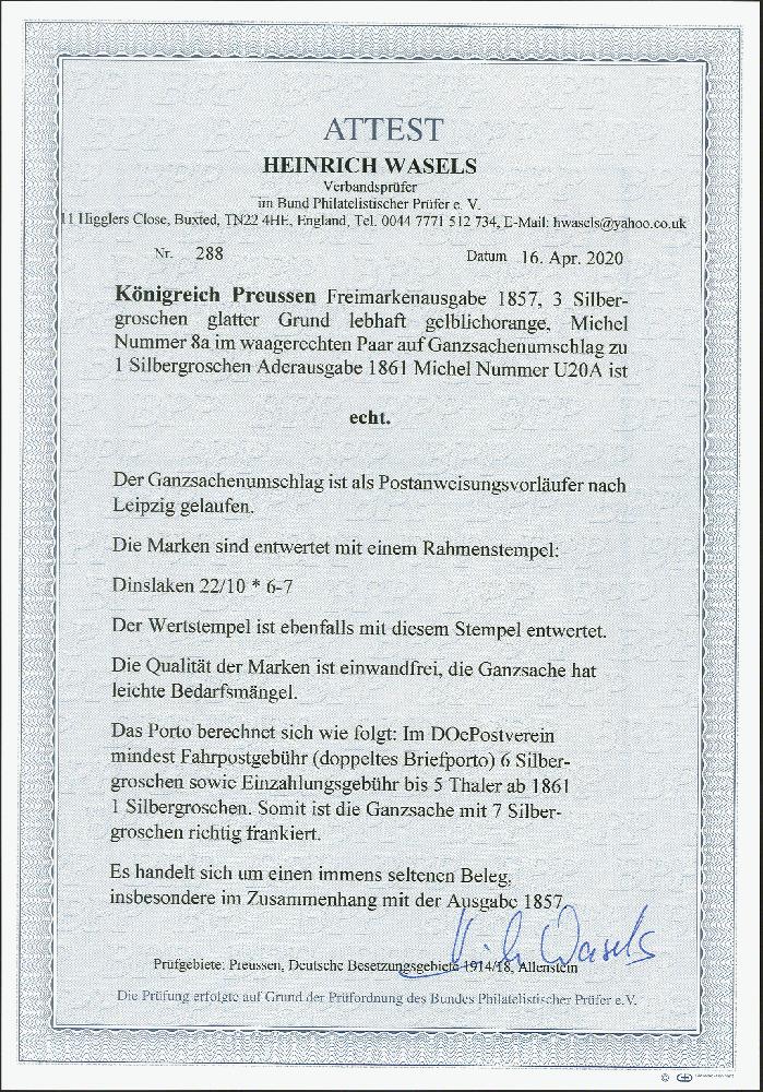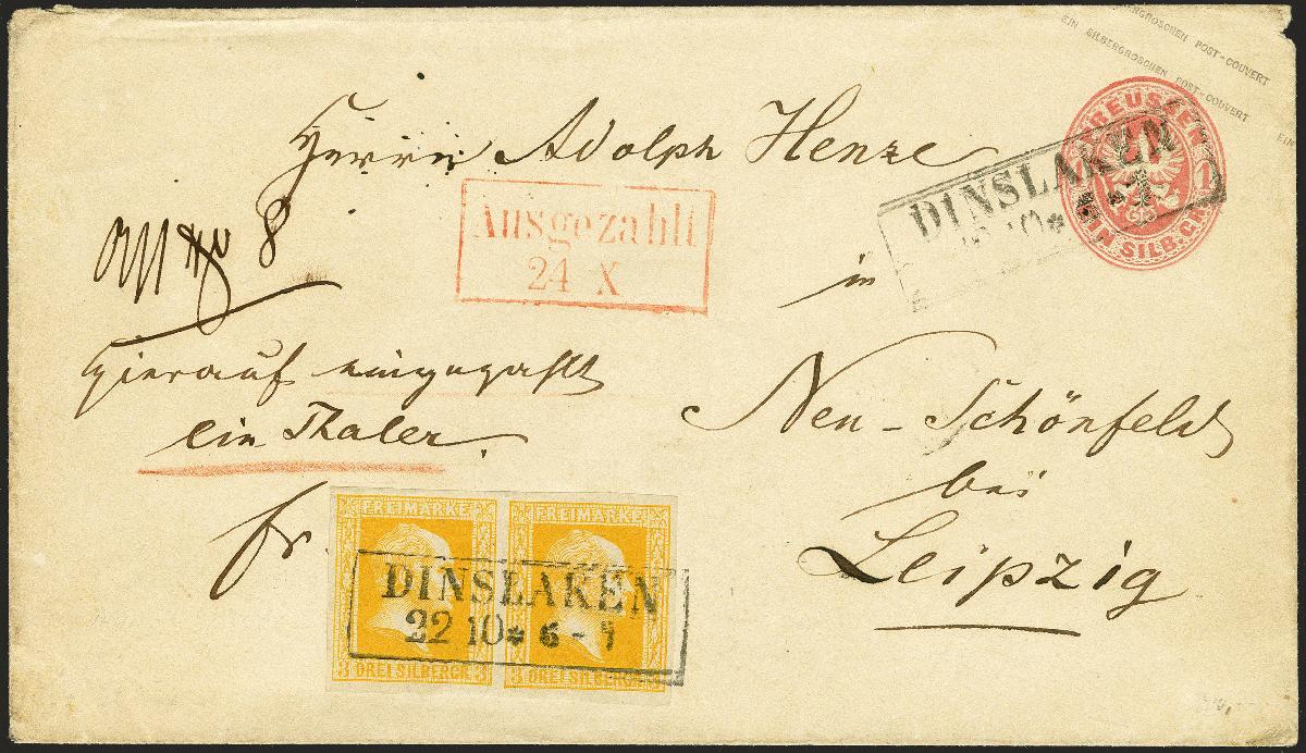 | Zusatzinformationen und Suchstichworte: | 374. Auktion Heinrich Köhler Auktionstermin 27.06.2020 Los 240 1861, Umschlag 1 Silbergroschen rosa mit Zufrankatur Glatter Grund 3 Silbergroschen gelborange im waagerechten Paar, sehr schön farbfrisch und voll- bis meist breitrandig, mit Rahmenstempel "DINSLAKEN 22 10", mit handschriftlichem Vermerk "hierauf eingezahlt ein Thaler" an die bekannte Adresse Adolf Henze, Leipzig mit vorderseitigem roten Rahmenstempel "Ausgezahlt 24 X". Ein sehr seltener Postanweisungs-Vorläufer in schöner Erhaltung. Das Paar einwandfrei, die Ganzsache leichte Beförderungsspuren. Fotoattest Wasels BPP (2020) (Mi.-Nr. U20A+8a) Ausruf 300,00 EUR Zuschlag 500,00 EUR (aus der Sammlung Erivan Haub) |