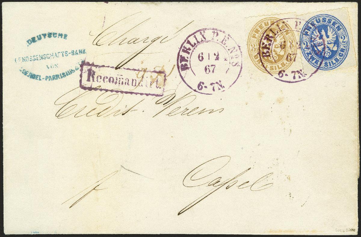 | Zusatzinformationen und Suchstichworte: | 374. Auktion Heinrich Köhler Auktionstermin 27.06.2020 Los 250 "BERLIN P.E.No.8 6/2 67", violetter Doppelkreisstempel auf 3 Silbergroschen ocker und 2 Silbergroschen ultramarin und nebengesetzt auf Chargé-Brief mit ebenfalls violettem Rahmenstempel "Recomandirt." nach Kassel. Der Brief ist etwas gereinigt, die Faltung an einigen Stellen gebrochen. Ein seltener Berlin-Beleg, insbesondere als Chargé-Brief mit dem violetten Rahmenstempel. Fotoattest Dr. Bringmann BPP (1991) (Mi.-Nr. 18a,17a) Ausruf 300,00 EUR Zuschlag 300,00 EUR (aus der Sammlung Erivan Haub) |
