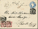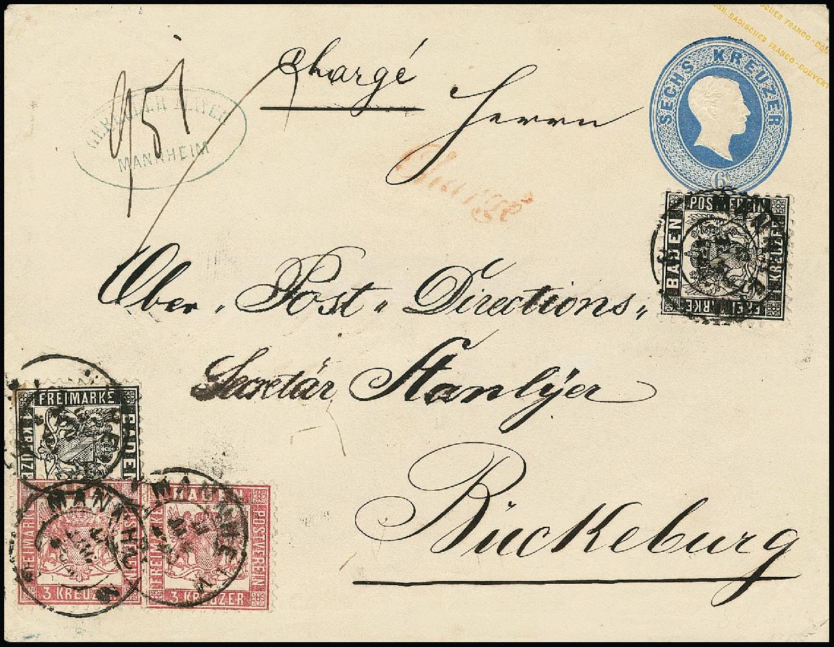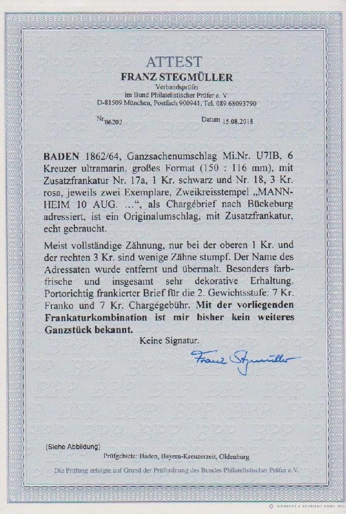 | Zusatzinformationen und Suchstichworte: | Rauhut & Kruschel - 213. Auktion 16. - 17. September 2022 Los 16 Altdeutschland Baden 1 Kr. schwarz und 3 Kr. rosa je per zwei (jeweils ein Wert min. stumpfe Zähnchen) auf Ganzsache 6 Kr. ultramarin im Großformat (Adreßname neu geschrieben), mit K2 "Mannheim" eingeschrieben nach Bückeburg. Die Großformat-Ganzsache U7IB ist nach den beiden 12- und 18-Kreuzer-Couverts die seltenste Baden-Ganzsache (Mi. 3000,-), nur wenige gebrauchte Couverts bekannt, zudem in dieser dekorativen Kombination ein Unikat, wie auch das Attest Stegmüller bestätigt Ausruf 1.000,00 EUR |