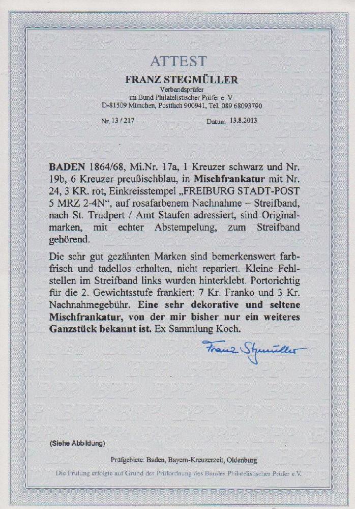 | Zusatzinformationen und Suchstichworte: | Rauhut & Kruschel - 213. Auktion 16. - 17. September 2022 Los 17 Altdeutschland Baden 1 Kr. schwarz und 6 Kr. preußischblau in Mischfrankatur mit 3 Kr. karmin, Kabinettstücke auf dekorativem rosa Vordruck-Nachnahme-Streifband (links oben kleiner verklebter Papierfehler) mit K1 "Freiburg Stadtpost" nach St. Trudpert/Staufen (rs. Postablagestempel von Wasen-Hof). Eine sehr seltene und nur noch ein weiteres Mal registrierte Kombination in schöner, ursprünglicher Erhaltung, ex Slg. Koch, Kaiser. Atteste Brettl, Stegmüller Zuschlag 720,00 EUR |