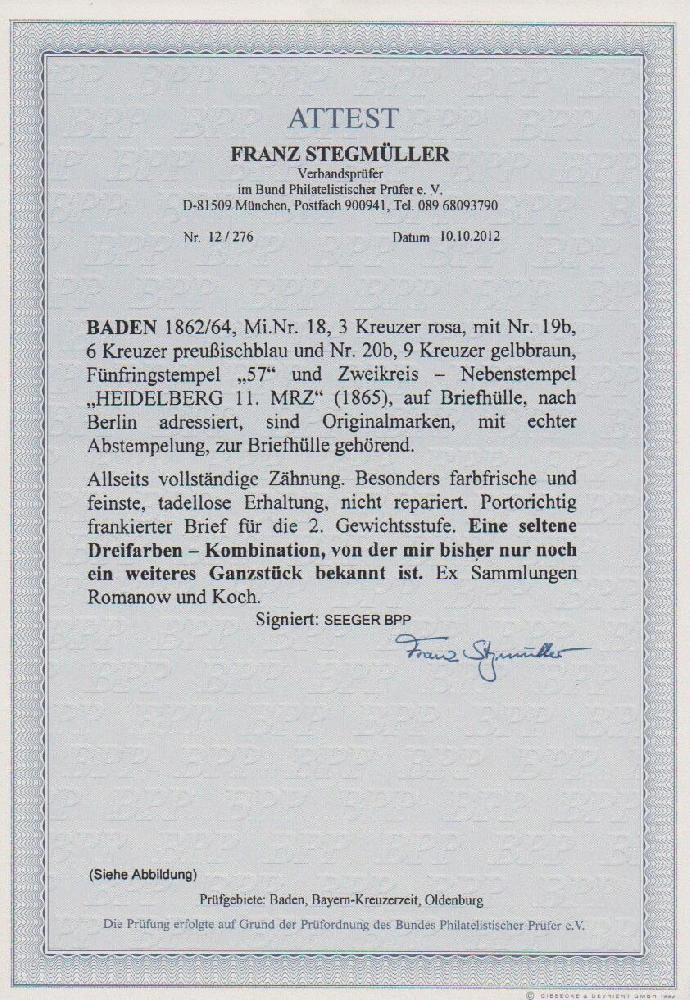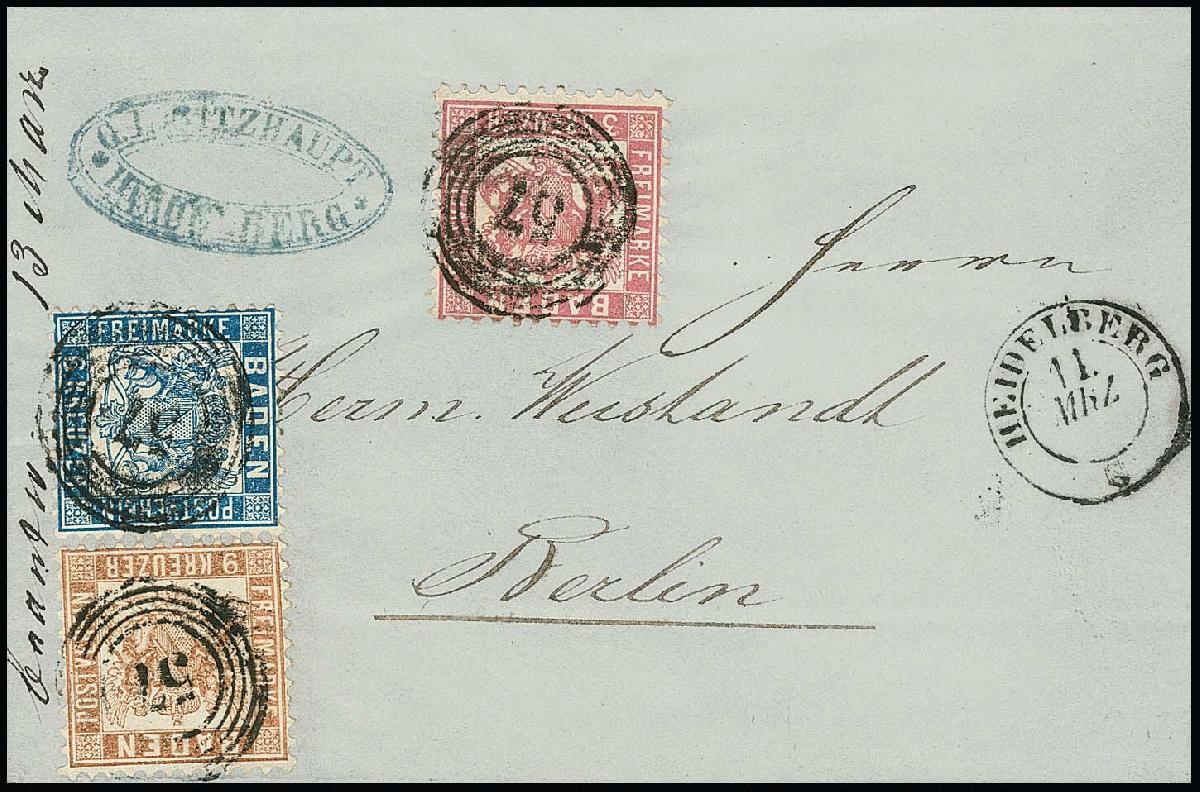 | Zusatzinformationen und Suchstichworte: | Rauhut & Kruschel - 213. Auktion 16. - 17. September 2022 Los 20 Altdeutschland Baden 3 Kr. rosa, 6 Kr. preußischblau und 9 Kr. gelbbraun auf frischem Kabinettbrief 1865 mit NS "57" und K2 "Heidelberg" nach Berlin (2. Gewichtsstufe). Äusserst seltene und nur noch ein weiteres Mal registrierte Frankatur-Kombination in dekorativer Erhaltung, ex Slg. Koch, Attest Stegmüller Zuschlag 1.650,00 EUR |