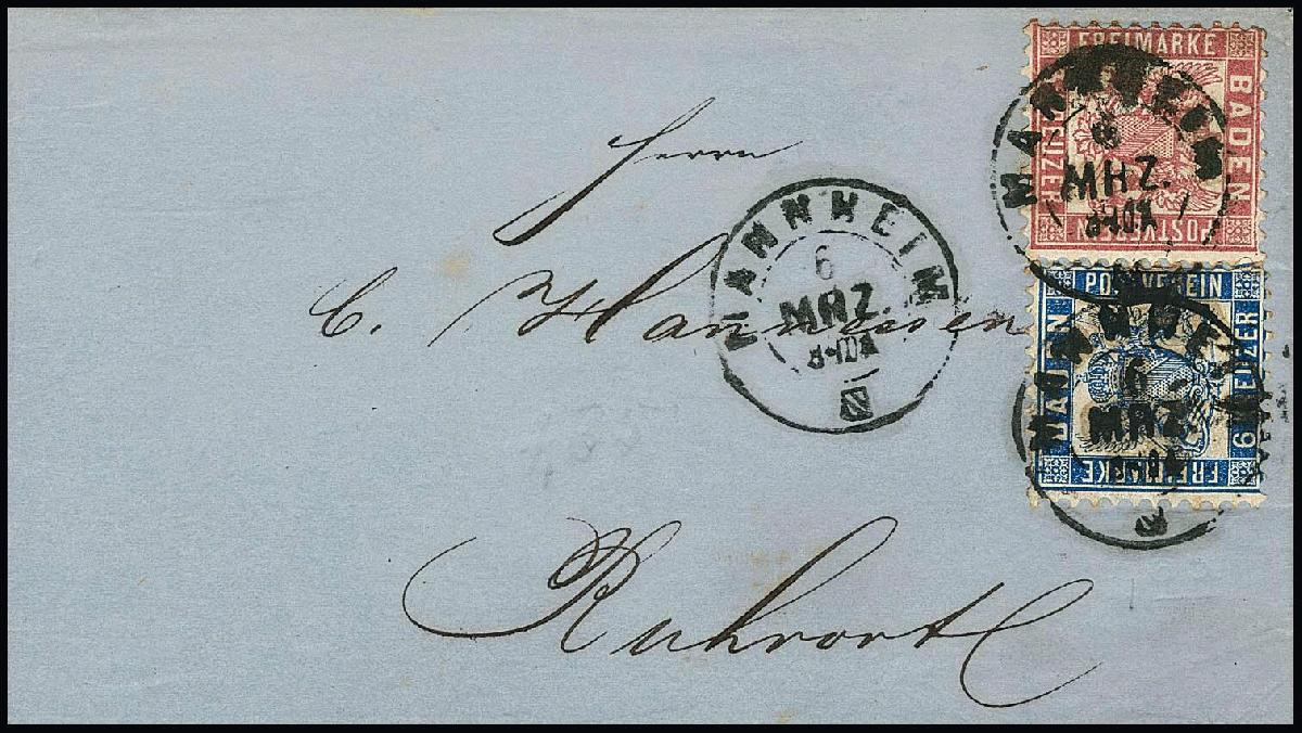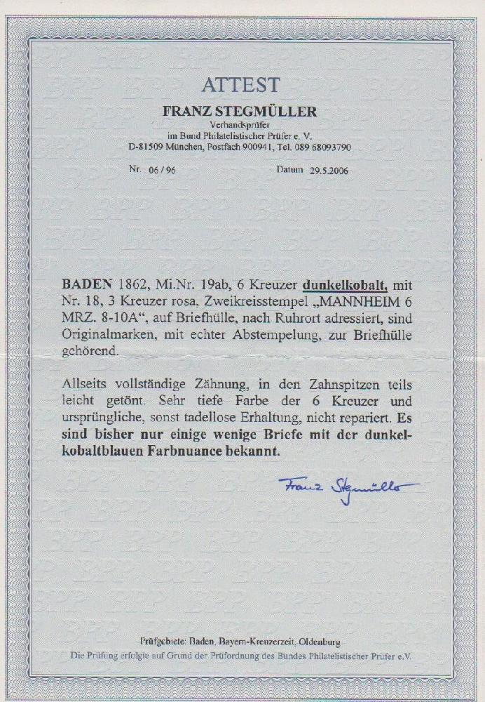 | Zusatzinformationen und Suchstichworte: | Rauhut & Kruschel - 213. Auktion 16. - 17. September 2022 Los 22 Altdeutschland Baden 6 Kr. dunkelkobalt, sehr seltene Nuance, und 3 Kr. rosa auf Postvereinsbrief von Mannheim nach Ruhrort bei Duisburg. Allseits vollzähnig, wenige Zahnspitzen leicht getönt, sehr seltene Buntfrankatur mit der Nr. 19ab, die aufgrund der Seltenheit im Michel auf Brief ohne Bewertung ist. Attest Stegmüller Zuschlag 580,00 EUR |
