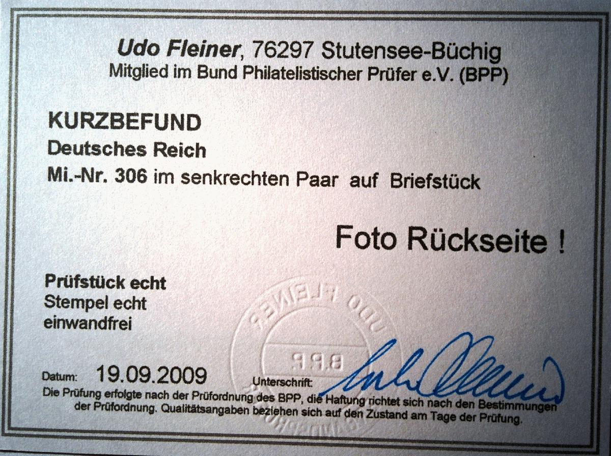 | Prüfer: | Fleiner, Udo (BPP (Bund Philatelistischer Prüfer)) |